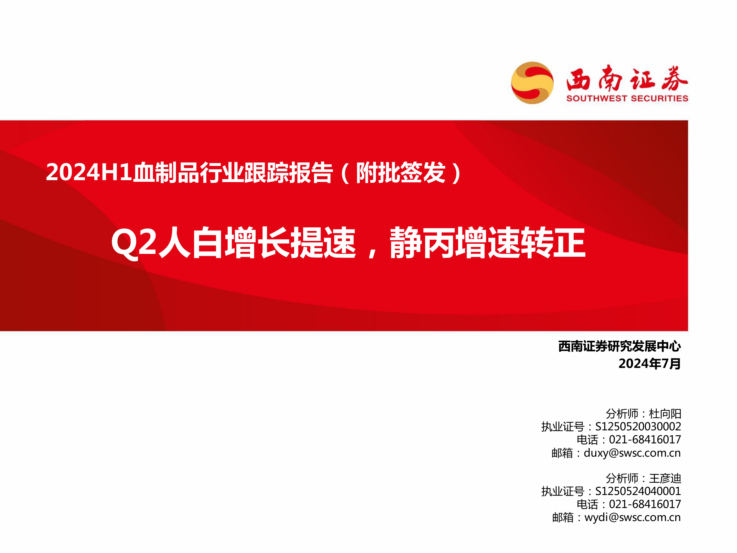 2024H1血制品行业跟踪报告(附批签发):Q2人白增长提速,静丙增速转正