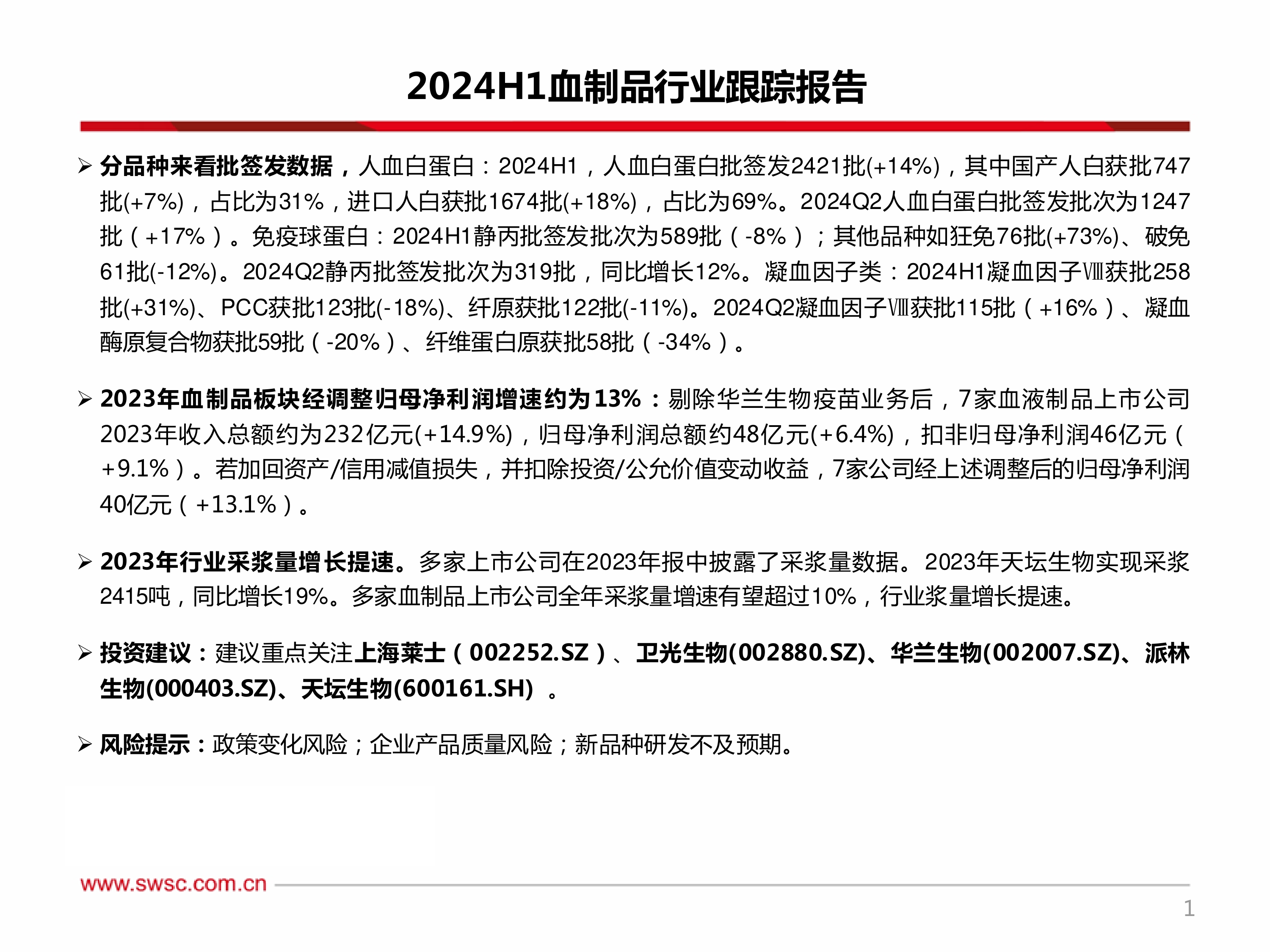 投资建议:建议重点关注上海莱士(002252.SZ)、卫光生物(002880.SZ)、华兰生物(002007.SZ)、派林生物(000403.SZ)、天坛生物(600161.SH)。