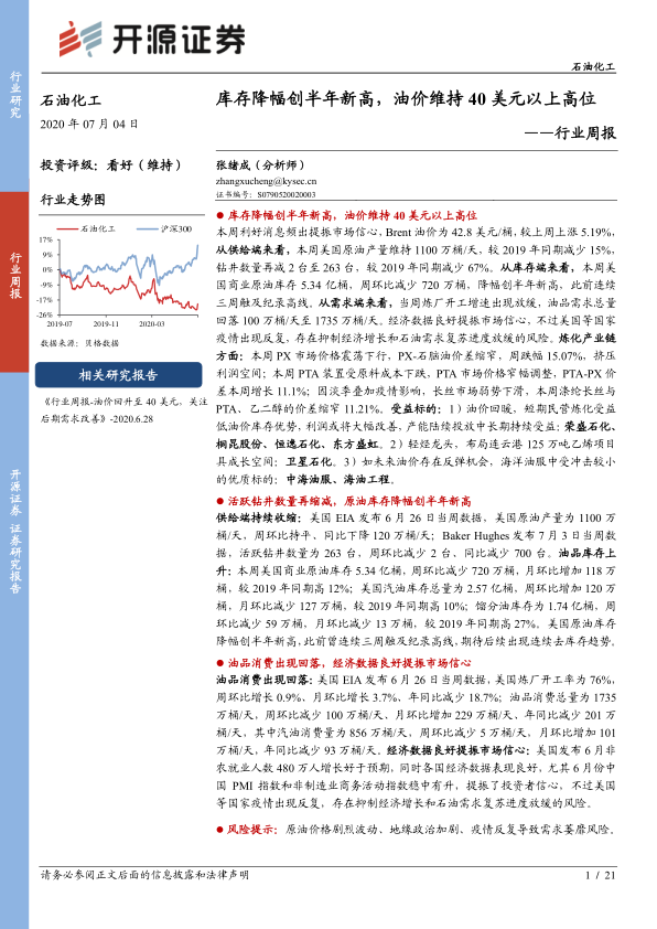 石油化工行业周报:库存降幅创半年新高,油价维持40美元以上高位