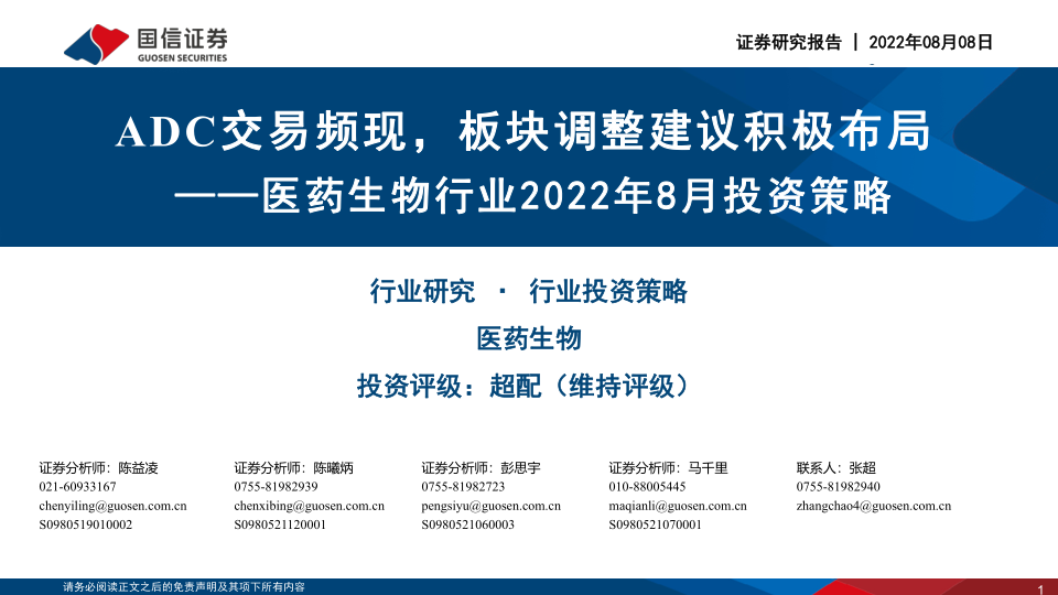 医药生物行业2022年8月投资策略:ADC交易频现,板块调整建议积极布局