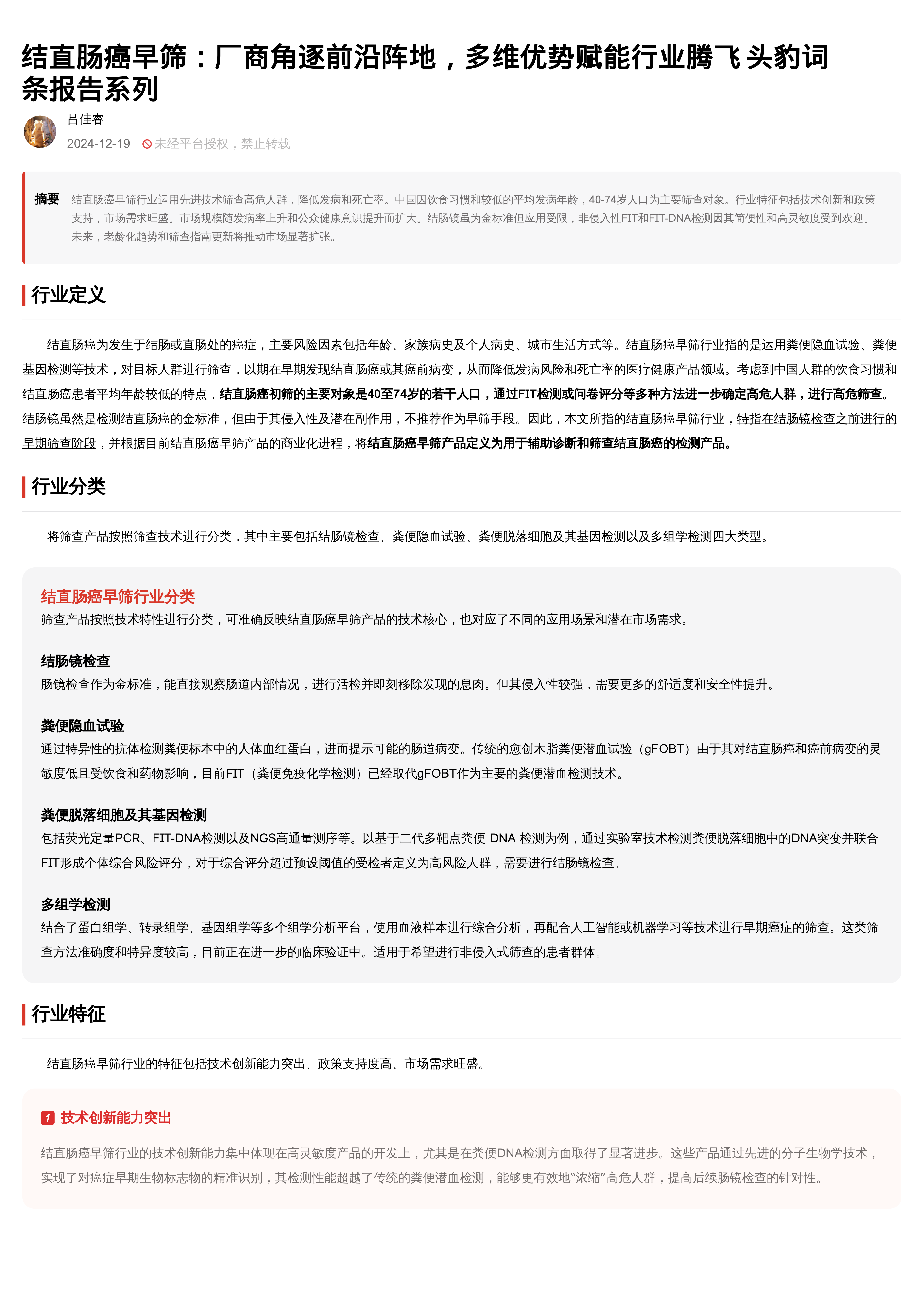 报告首先定义了结直肠癌早筛行业,并根据筛查技术对产品进行了分类,主要包括:结肠镜检查、粪便隐血试验(FIT)、粪便脱落细胞及其基因检测(FIT-DNA、NGS等)、多组学检测。其中,FIT和FIT-DNA检测因其非侵入性和高灵敏度而受到欢迎,成为市场主流。