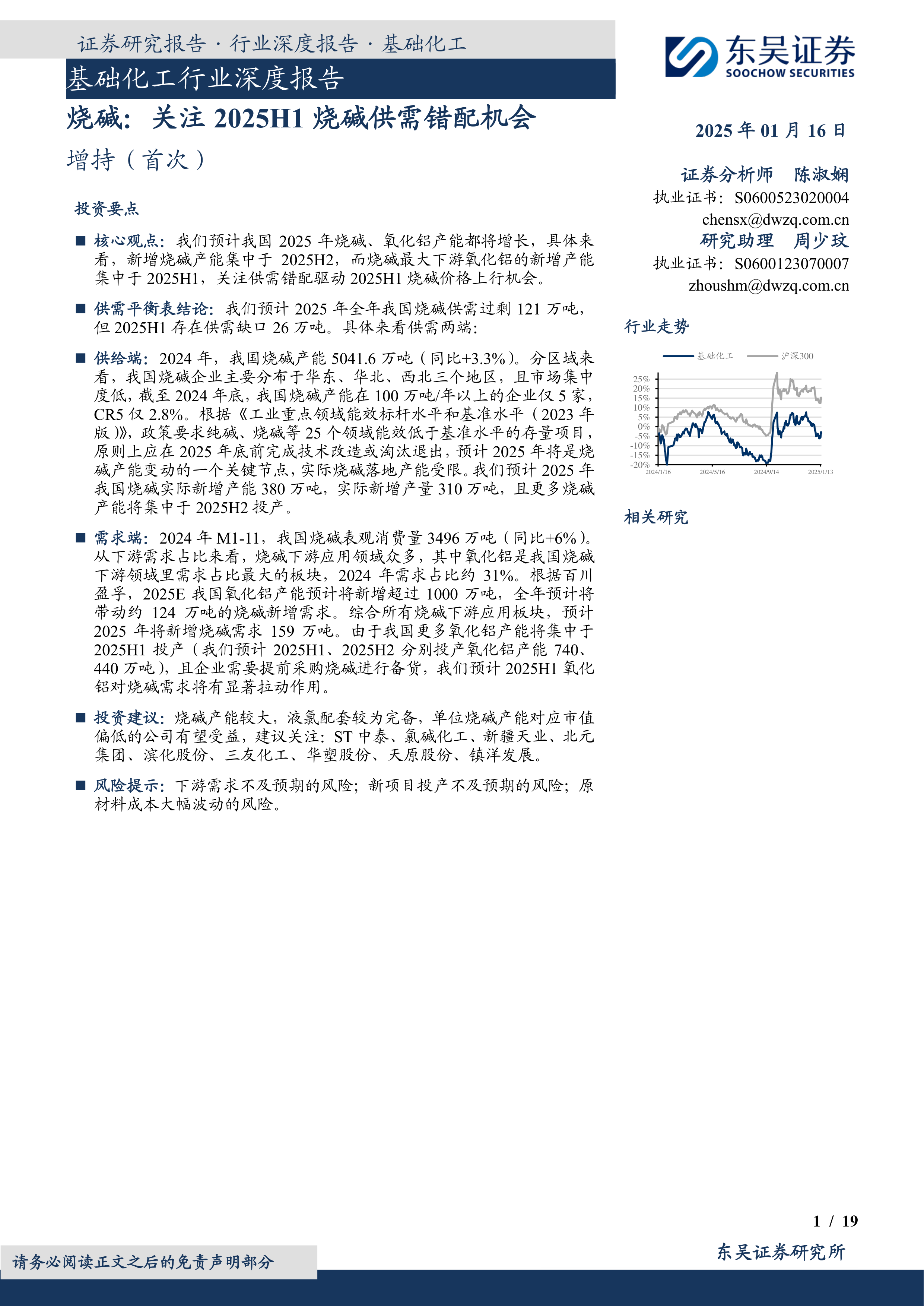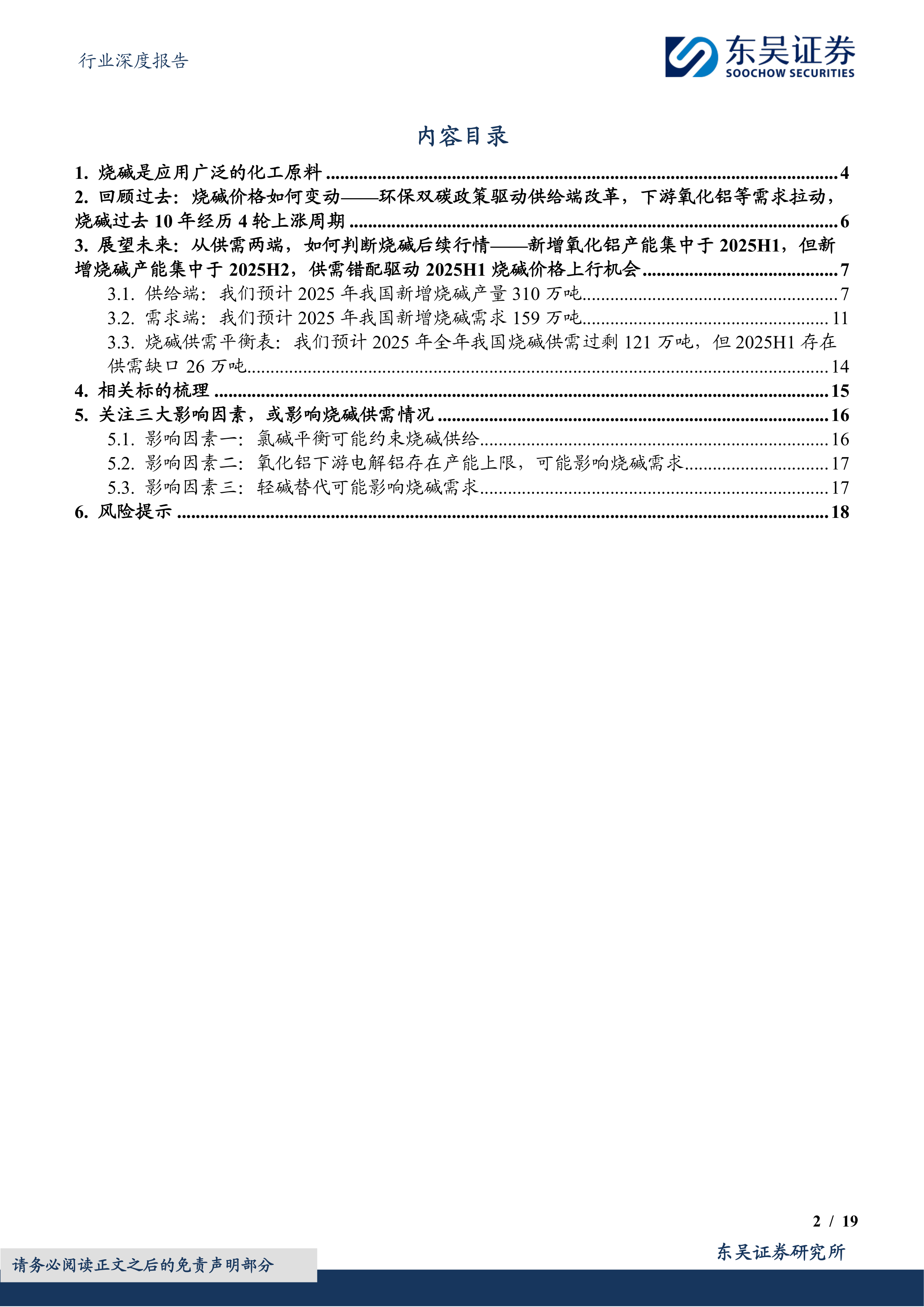 本报告基于对中国烧碱行业供需两端的深入分析,预测2025年上半年将出现供需错配,从而驱动烧碱价格上行。虽然全年预计供需过剩,但上半年的供需缺口为投资者提供了短期投资机会。报告同时指出了氯碱平衡、电解铝产能上限以及轻碱替代等三个可能影响烧碱供需的关键因素,为投资者提供了更全面的市场分析。 投资者需谨慎评估相关风险,并结合自身情况做出投资决策。