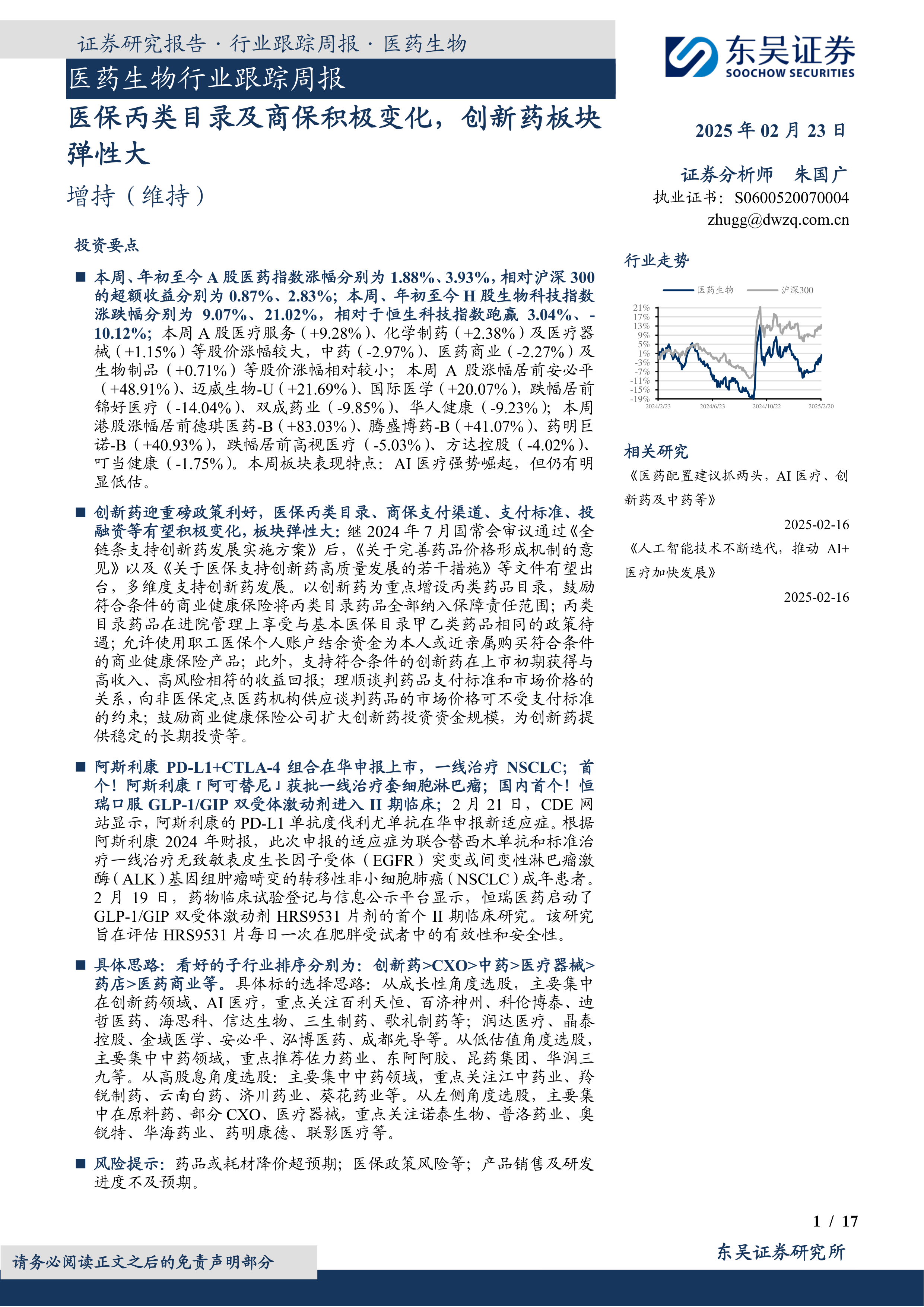 本报告的核心观点是:医药生物行业在2025年2月23日呈现出较强的弹性,尤其创新药板块受益于利好政策,值得关注。 具体而言,报告从以下几个方面阐述了这一观点: