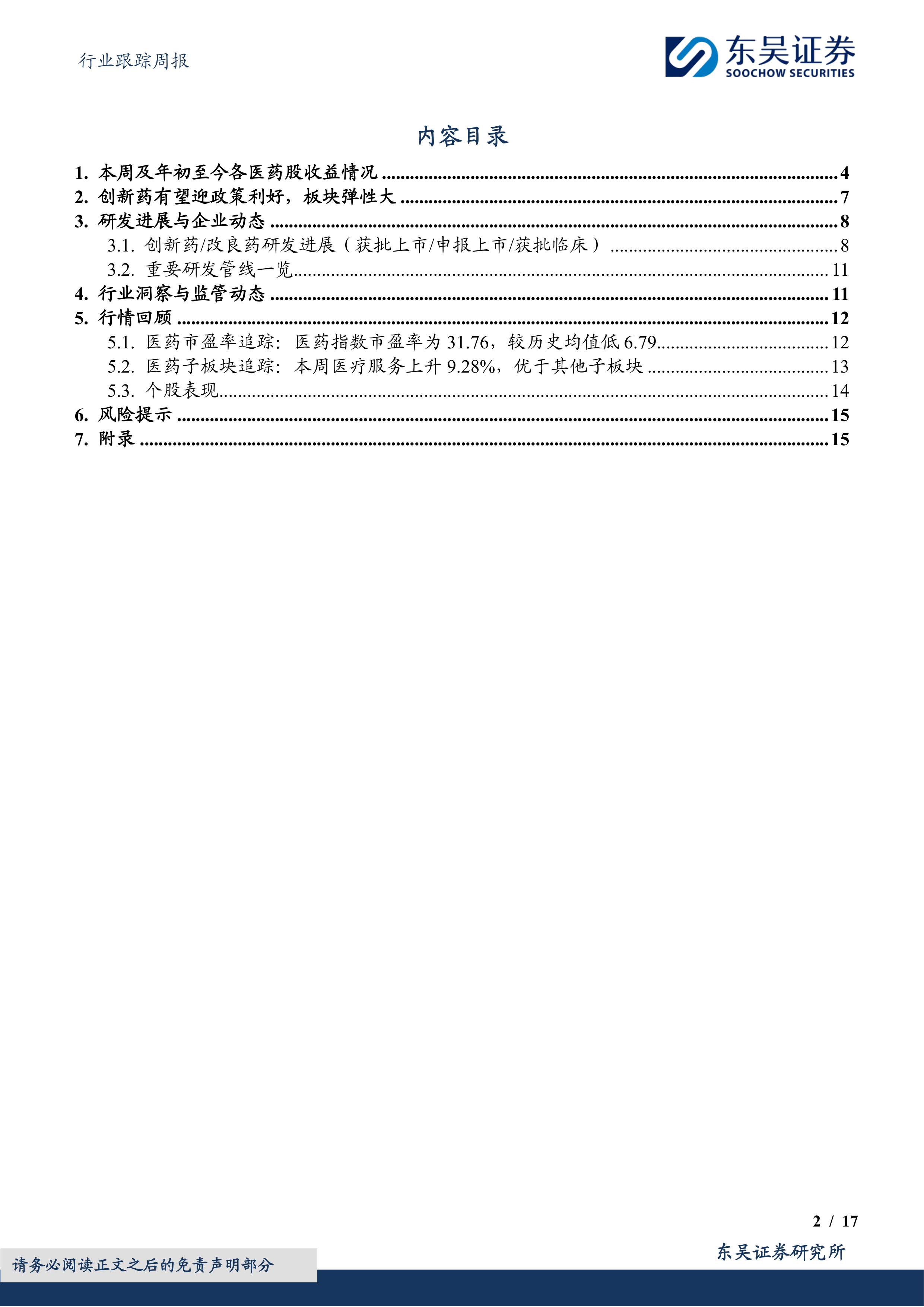 报告对医药指数市盈率进行了追踪,并对医药子板块的估值情况进行了分析,指出医药指数市盈率低于历史均值。 报告还提供了相关图表,直观地展现了医药行业及子板块的市场表现和估值水平。