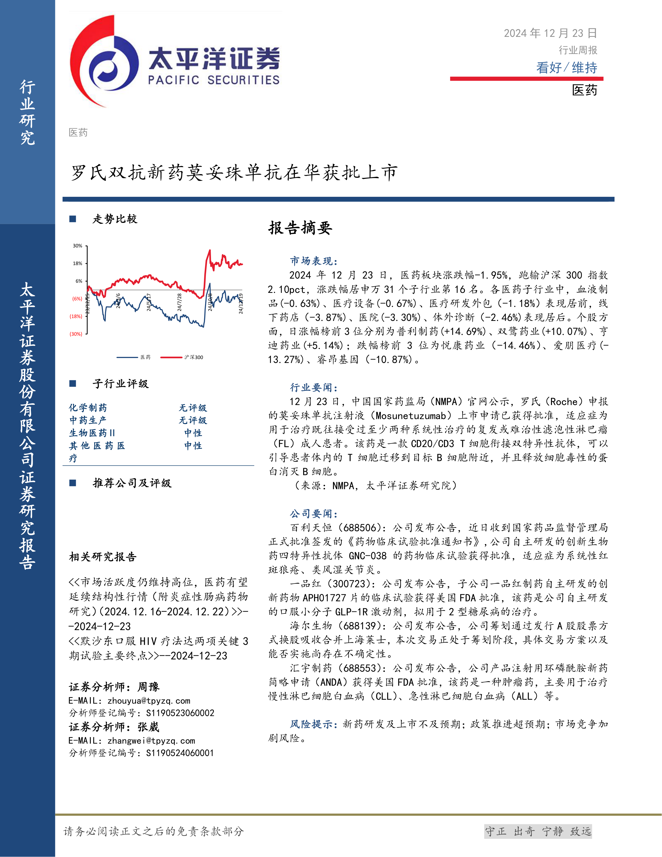 医药行业周报:罗氏双抗新药莫妥珠单抗在华获批上市