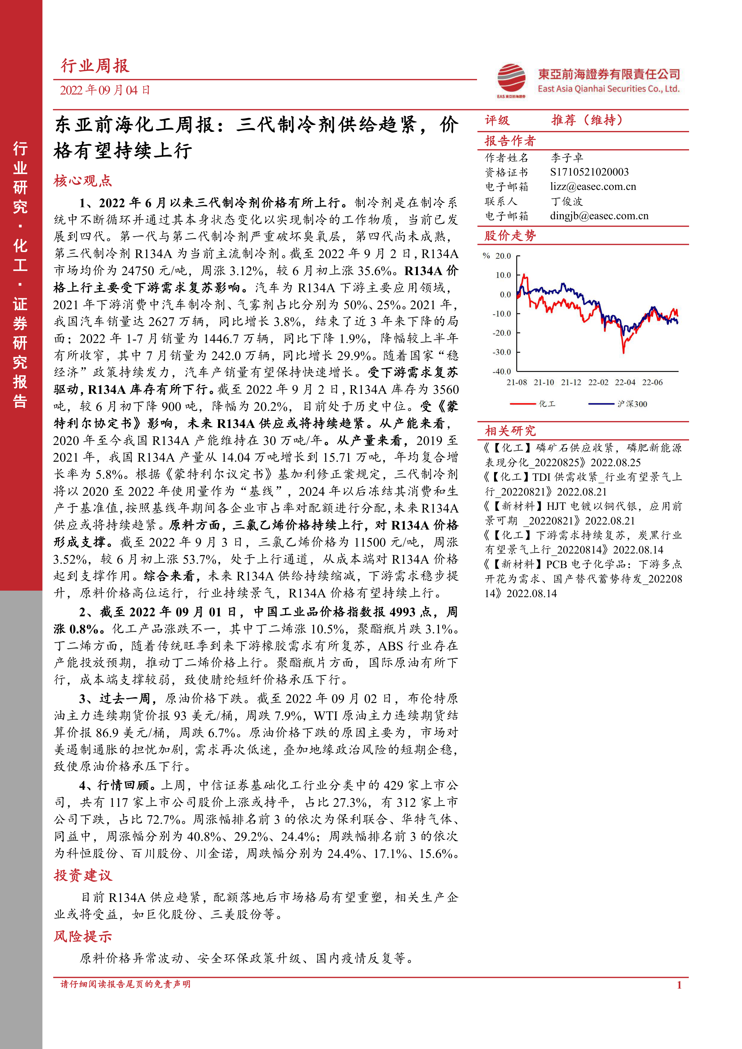 1、2022 年 6 月以来三代制冷剂价格有所上行。制冷剂是在制冷系统中不断循环并通过其本身状态变化以实现制冷的工作物质,当前已发展到四代。第一代与第二代制冷剂严重破坏臭氧层,第四代尚未成熟,第三代制冷剂 R134A 为当前主流制冷剂。 截至 2022 年 9 月 2 日, R134A市场均价为 24750 元/吨,周涨 3.12%,较 6 月初上涨 35.6%。R134A 价格上行主要受下游需求复苏影响。汽车为 R134A 下游主要应用领域,2021 年下游消费中汽车制冷剂、 气雾剂占比分别为 50%、 25%。 2021 年,我国汽车销量达 2627 万辆,同比增长 3.8%,结束了近 3 年来下降的局面;2022 年 1-7 月销量为 1446.7 万辆,同比下降 1.9%,降幅较上半年有所收窄,其中 7 月销量为 242.0 万辆,同比增长 29.9%。随着国家“稳经济”政策持续发力,汽车产销量有望保持快速增长。受下游需求复苏驱动, R134A 库存有所下行。 截至 2022 年 9 月 2 日, R134A 库存为 3560吨,较 6 月初下降 900 吨,降幅为 20.2%,目前处于历史中位。受《蒙特利尔协定书》影响,未来 R134A 供应或将持续趋紧。从产能来看,2020 年至今我国 R134A 产能维持在 30 万吨/年。从产量来看,2019 至2021 年,我国 R134A 产量从 14.04 万吨增长到 15.71 万吨,年均复合增长率为 5.8%。根据《蒙特利尔议定书》基加利修正案规定,三代制冷剂将以 2020 至 2022 年使用量作为“基线”,2024 年以后冻结其消费和生产于基准值, 按照基线年期间各企业市占率对配额进行分配, 未来R134A供应或将持续趋紧。原料方面,三氯乙烯价格持续上行,对 R134A 价格形成支撑。截至 2022 年 9 月 3 日,三氯乙烯价格为 11500 元/吨,周涨3.52%,较 6 月初上涨 53.7%,处于上行通道,从成本端对 R134A 价格起到支撑作用。综合来看,未来 R134A 供给持续缩减,下游需求稳步提升,原料价格高位运行,行业持续景气,R134A 价格有望持续上行。