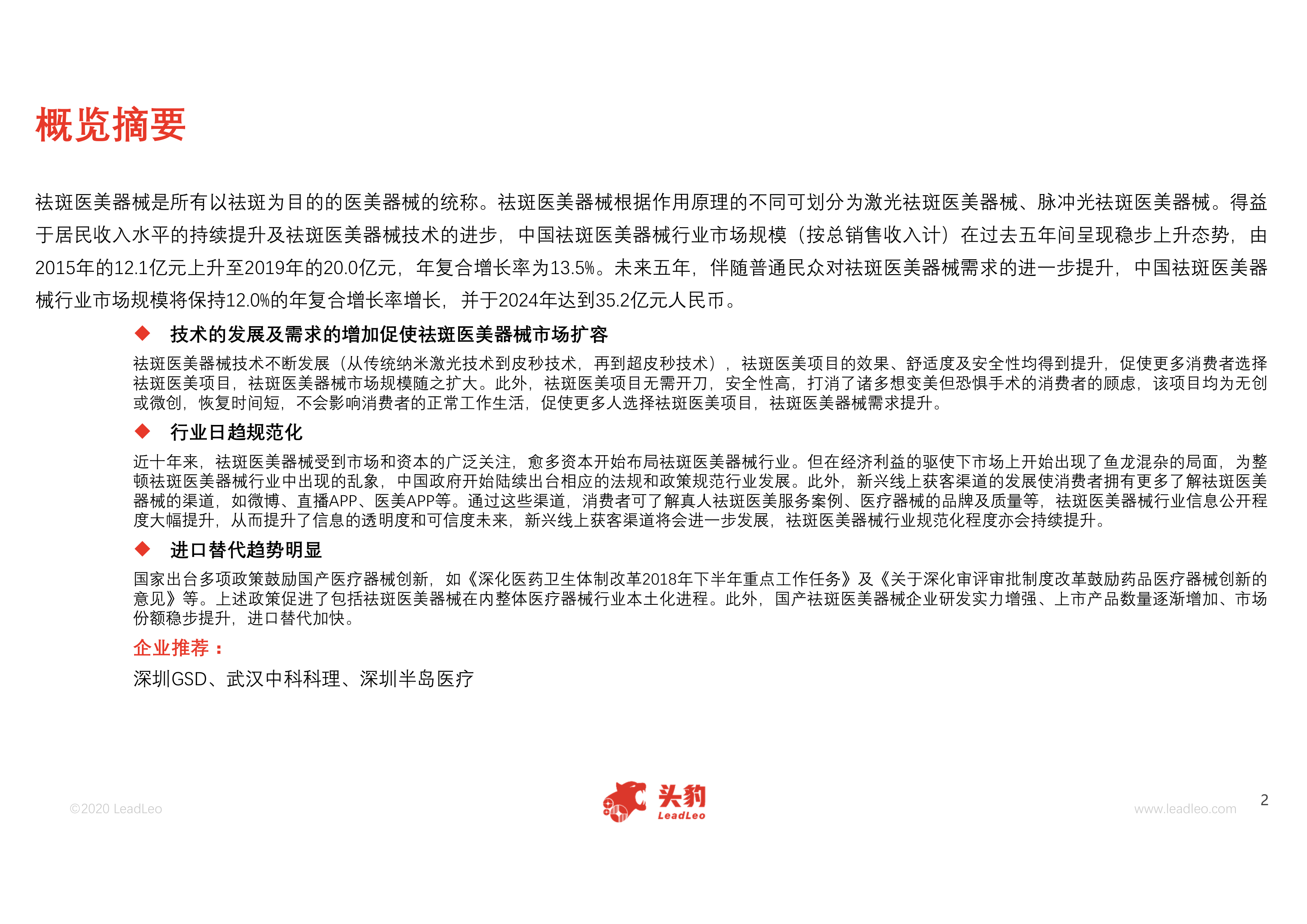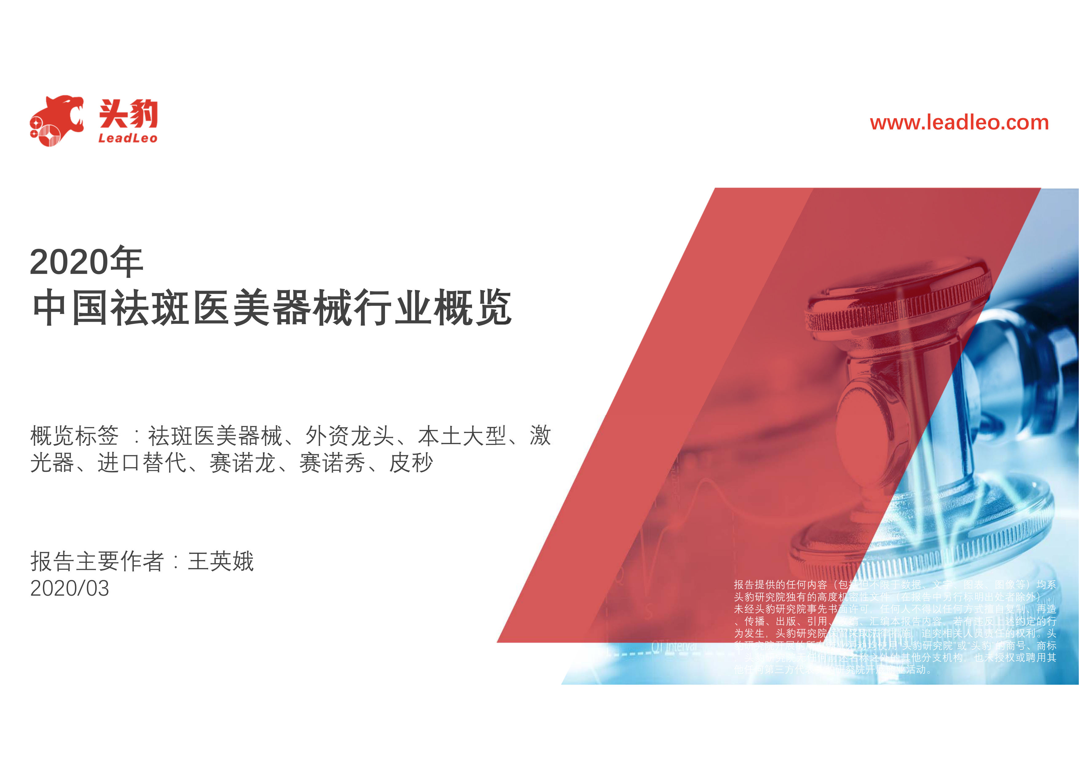 本报告基于头豹研究院2020年发布的《中国祛斑医美器械行业概览》进行数据分析,核心观点如下: