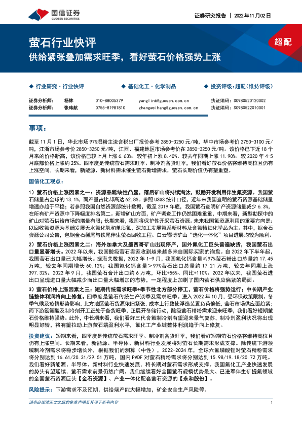 本报告的核心观点是:萤石价格在2022年11月1日达到近18个月来的新高,并有望继续上涨。这一趋势主要由以下三个因素驱动: