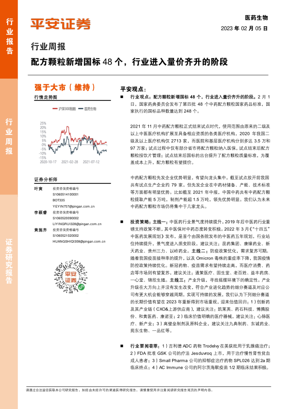 本报告分析了中药配方颗粒行业在国家政策支持下进入量价齐升阶段的现状,并指出龙头企业优势明显,市场集中度将进一步提升。 此外,报告还对中医药行业整体景气度提升、疫情政策优化带来的需求复苏以及产业升级带来的投资机会进行了深入分析,并推荐了一系列值得关注的投资标的。 报告最后对A股和港股医药板块的行情进行了回顾,提供了市场表现和估值数据。 总而言之,报告认为在政策利好和市场需求复苏的背景下,医药行业,特别是中药配方颗粒行业和一些细分领域,具有较好的投资前景,但投资者仍需关注政策风险、研发风险和公司经营风险。