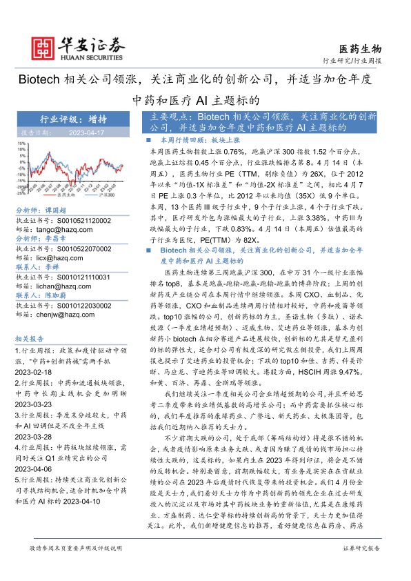 主要观点:Biotech相关公司领涨,关注商业化的创新公司,并适当加仓年度中药和医疗AI主题标的