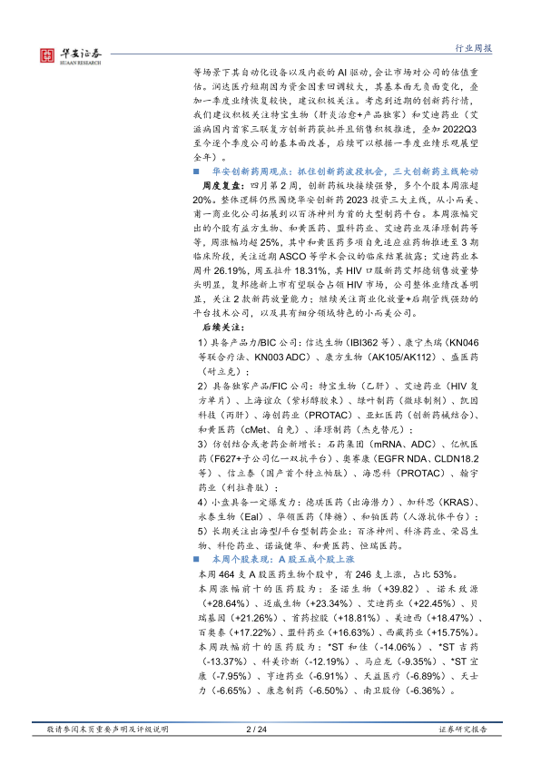 周度复盘:四月第2周,创新药板块接续强势,多个个股本周涨超20%。整体逻辑仍然围绕华安创新药2023投资三大主线,从小而美、甫一商业化公司拓展到以百济神州为首的大型制药平台。本周涨幅突出的个股有益方生物、和黄医药、盟科药业、艾迪药业及泽璟制药等等,周涨幅均超25%,其中和黄医药多项自免适应症药物推进至3期临床阶段,关注近期ASCO等学术会议的临床结果披露;艾迪药业本周升26.19%,周五拉升18.31%,其HIV口服新药艾邦德销售放量势头明显,复邦德新上市有望联合占领HIV市场,公司整体业绩改善明显,关注2款新药放量能力;继续关注商业化放量+后期管线强劲的平台技术公司,以及具有细分领域特色的小而美公司。