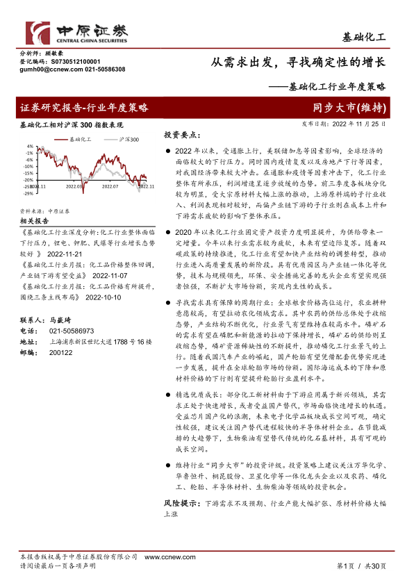 维持行业“同步大市”的投资评级。投资策略建议关注一体化龙头企业(万华化学、华鲁恒升、桐昆股份、卫星化学等),以及农化、磷化工、轮胎、半导体材料、生物柴油等领域的投资机会。