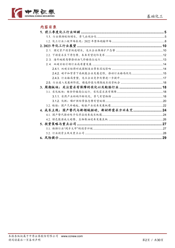 本报告对2022年前三季度基础化工行业进行了回顾,并对2023年行业发展趋势进行了展望。报告指出,2022年行业整体承压,但不同子行业表现分化;2023年行业投资增长,但下游需求复苏仍需时间;双碳政策将重塑行业格局,龙头企业将受益。报告最后给出了投资策略和重点公司建议,并提示了相关风险。 报告基于公开数据进行分析,仅供参考,不构成投资建议。