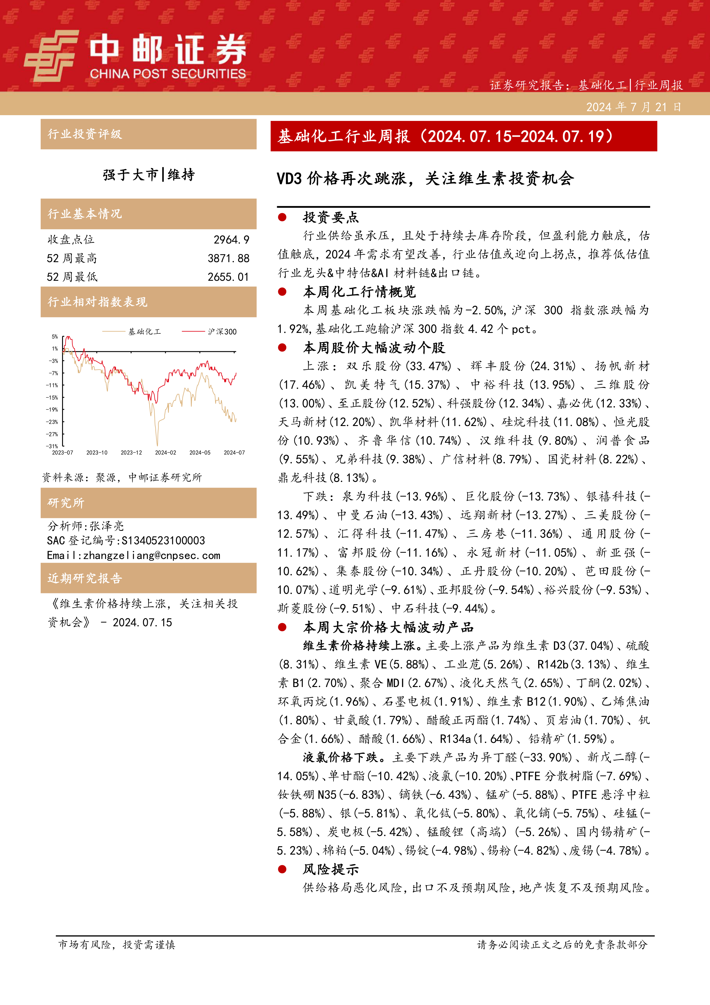 基础化工行业周报:VD3价格再次跳涨,关注维生素投资机会