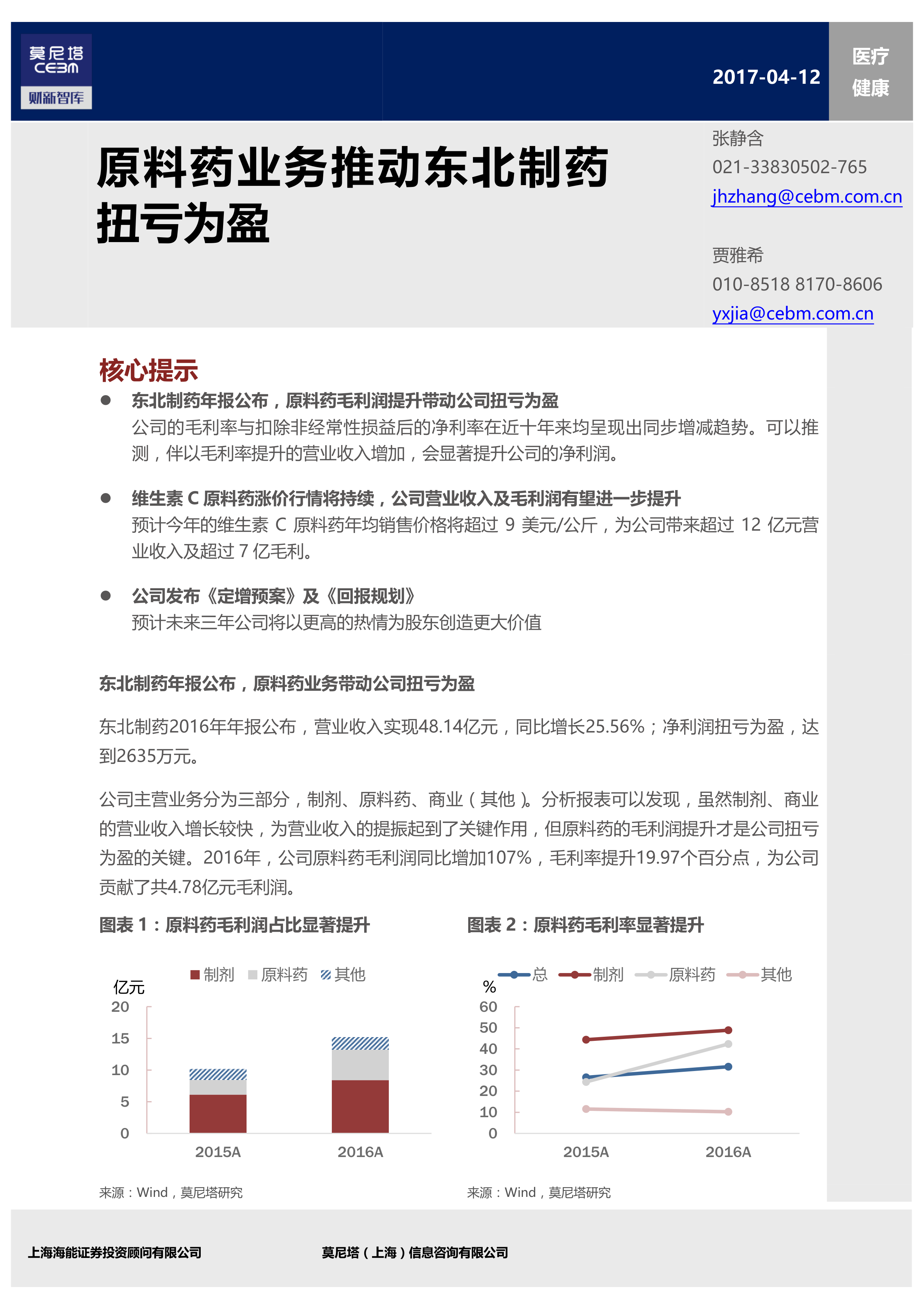 东北制药2016年扭亏为盈,主要归功于原料药业务,特别是维生素C原料药价格上涨带来的显著毛利润提升。维生素C价格上涨行情有望持续,公司未来盈利能力将进一步增强。同时,公司积极的资本运作和股东回报规划也为其长期发展提供了有力保障。本报告通过数据分析和专业解读,清晰地展现了东北制药的业绩增长点和未来发展潜力,为投资者提供了重要的参考信息。 然而,报告也应注意风险提示,例如维生素C价格波动风险、环保政策变化风险以及市场竞争风险等,这些因素都可能影响公司未来的业绩表现。 未来研究可以进一步深入分析公司在应对市场风险和提升核心竞争力方面的具体策略,以及对公司长期发展前景进行更深入的预测。