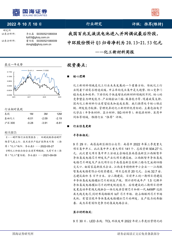 化工新材料周报:我国百兆瓦液流电池进入并网调试最后阶段,中环股份预计Q3归母净利为20.13-21.53亿元
