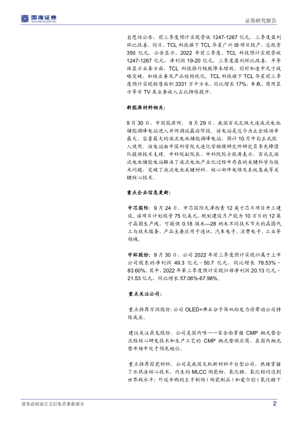 报告对万润股份、鼎龙股份、国瓷材料、飞凯材料、濮阳惠成、巨化股份、万盛股份、江化微、合盛硅业和彤程新材等十家公司进行了重点关注,并提供了其2022年9月30日的股价、2021年、2022年预期和2023年预期每股收益(EPS)以及市盈率(PE)等数据,以及投资评级。其中,万润股份、国瓷材料、飞凯材料、万盛股份和江化微获得“买入”评级。报告还总结了这些公司的近期公告信息,例如项目进展、业绩预告、融资情况等。