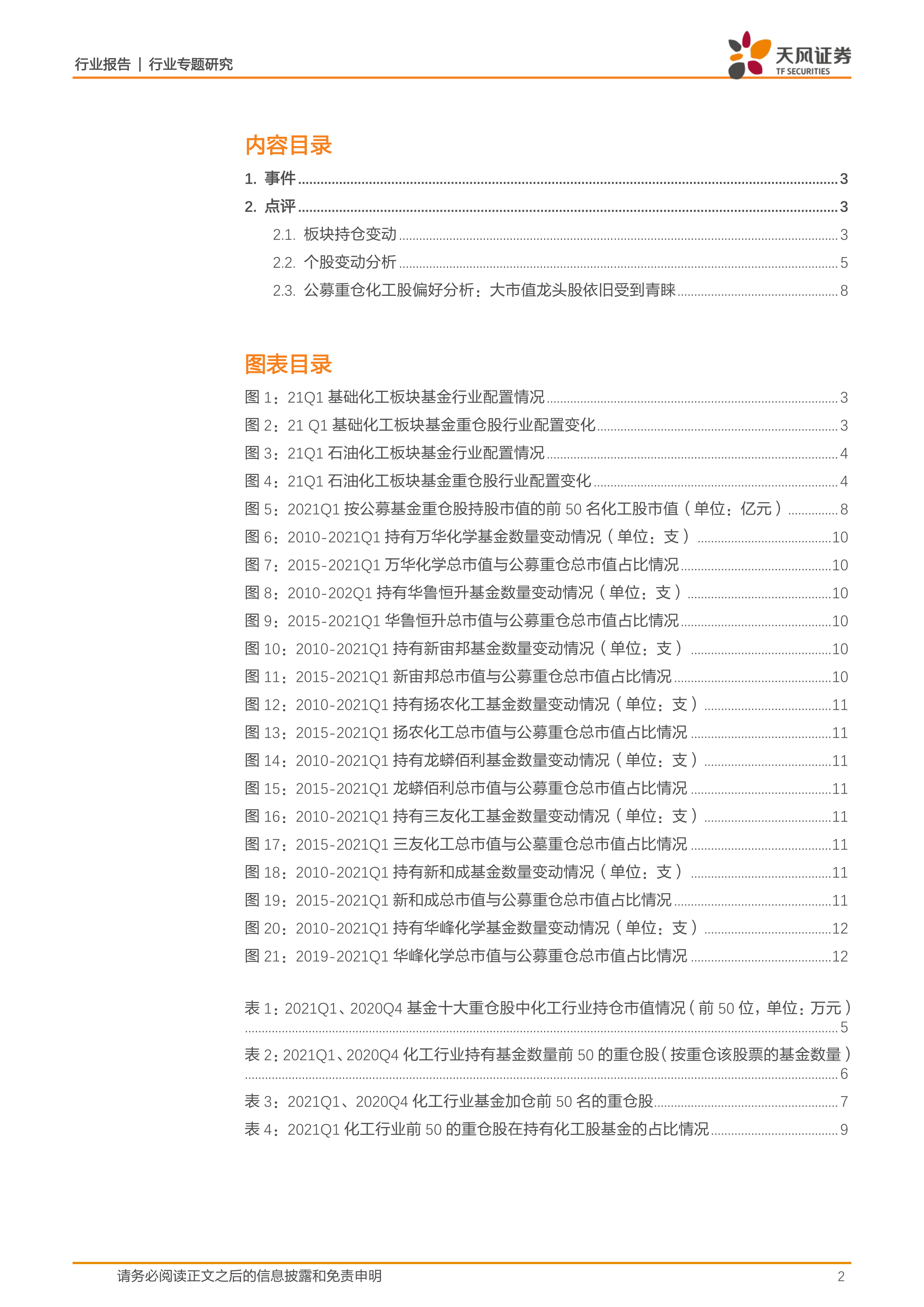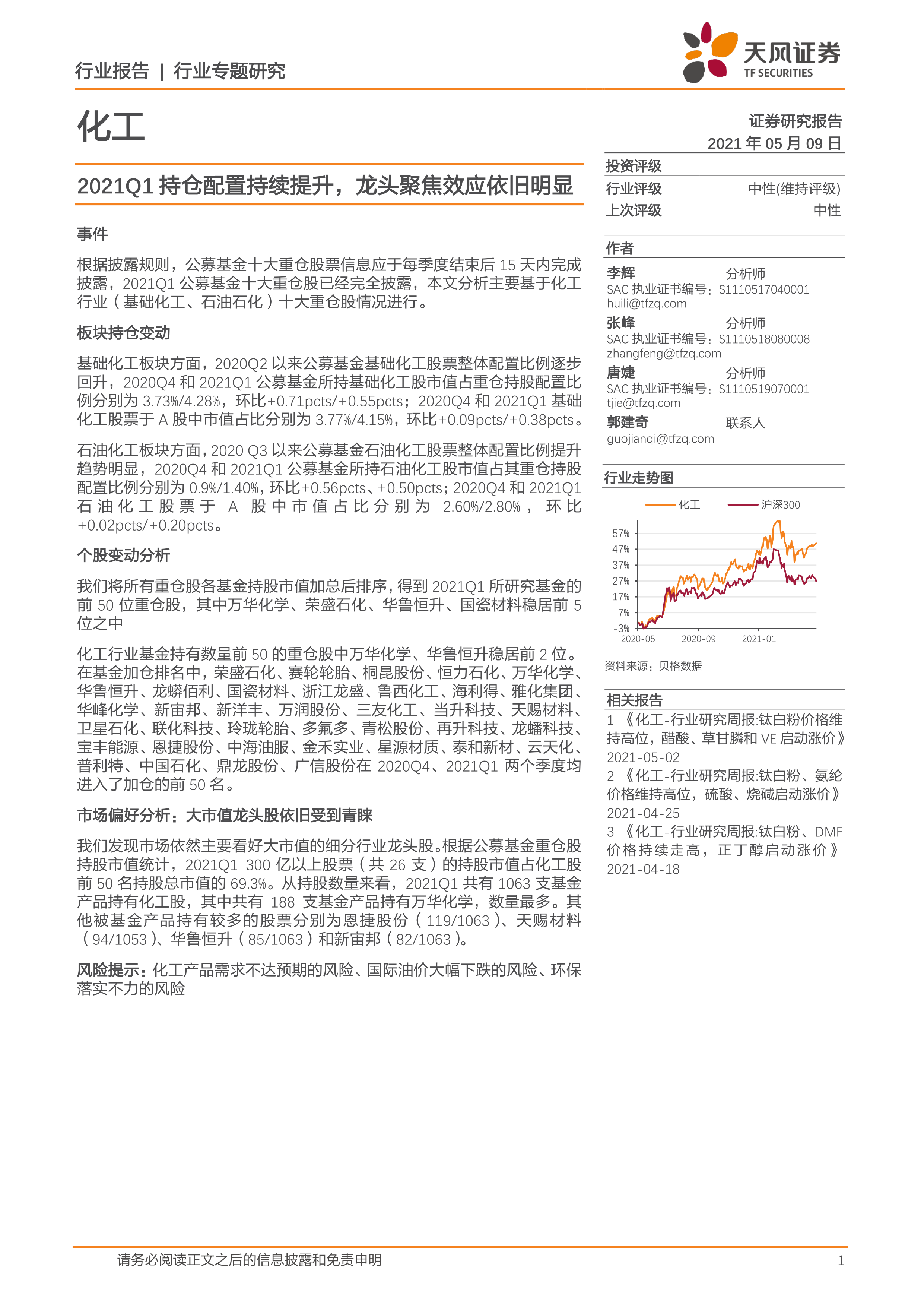 本报告通过对2021年第一季度公募基金持仓数据的分析,深入探讨了化工行业投资趋势。