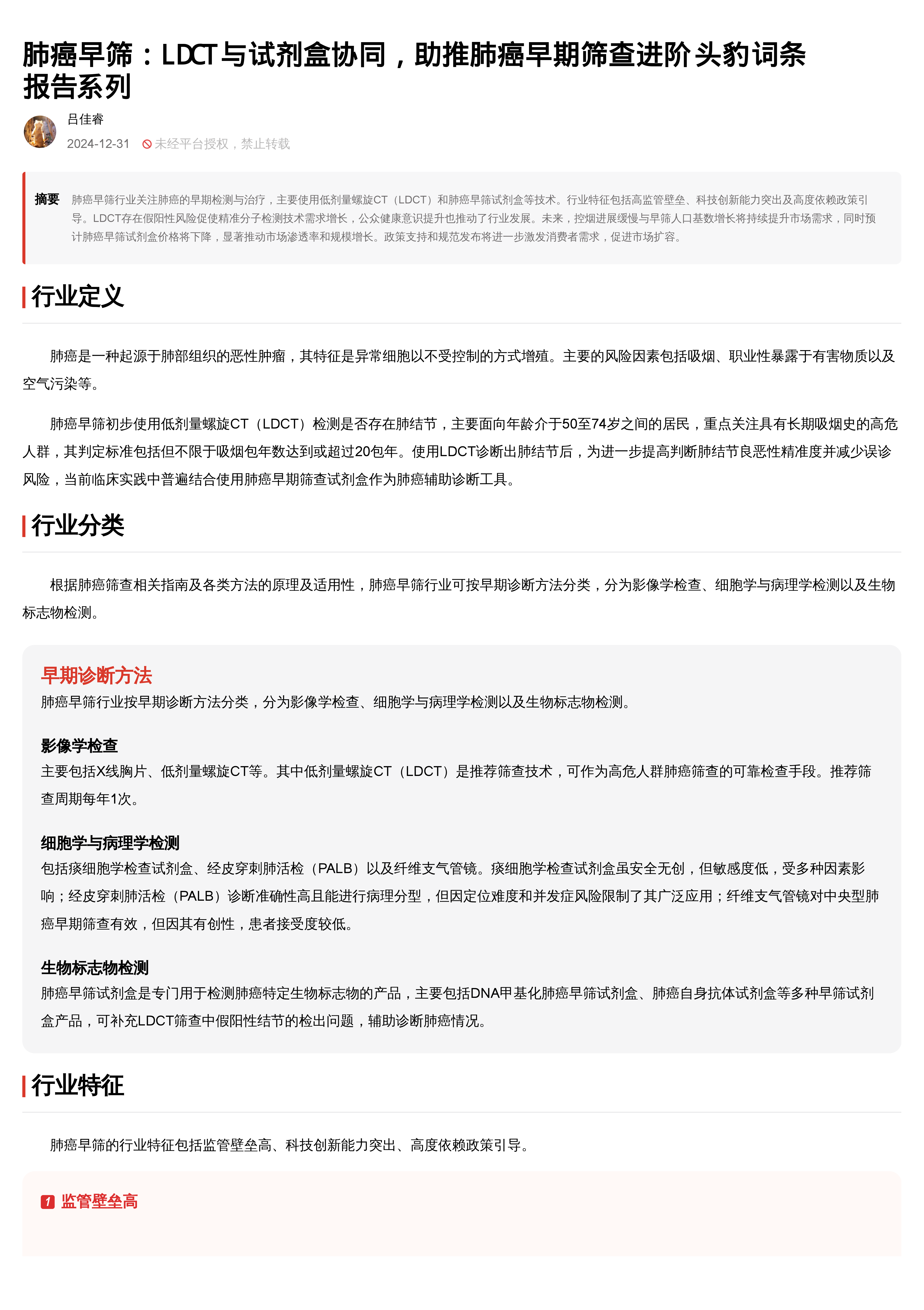 本报告首先对肺癌早筛行业进行了定义,指出其主要技术手段为LDCT和肺癌早筛试剂盒,并分析了行业特征(高监管壁垒、科技创新能力突出、高度依赖政策引导)。报告还梳理了行业发展历程,将其划分为萌芽期、启动期和高速发展期三个阶段,并对各阶段的关键事件和技术突破进行了详细描述。 值得注意的是,21世纪以来,特别是2011年NLST研究结果公布后,肺癌早筛行业进入高速发展期,并受到政府和资本市场的双重关注。