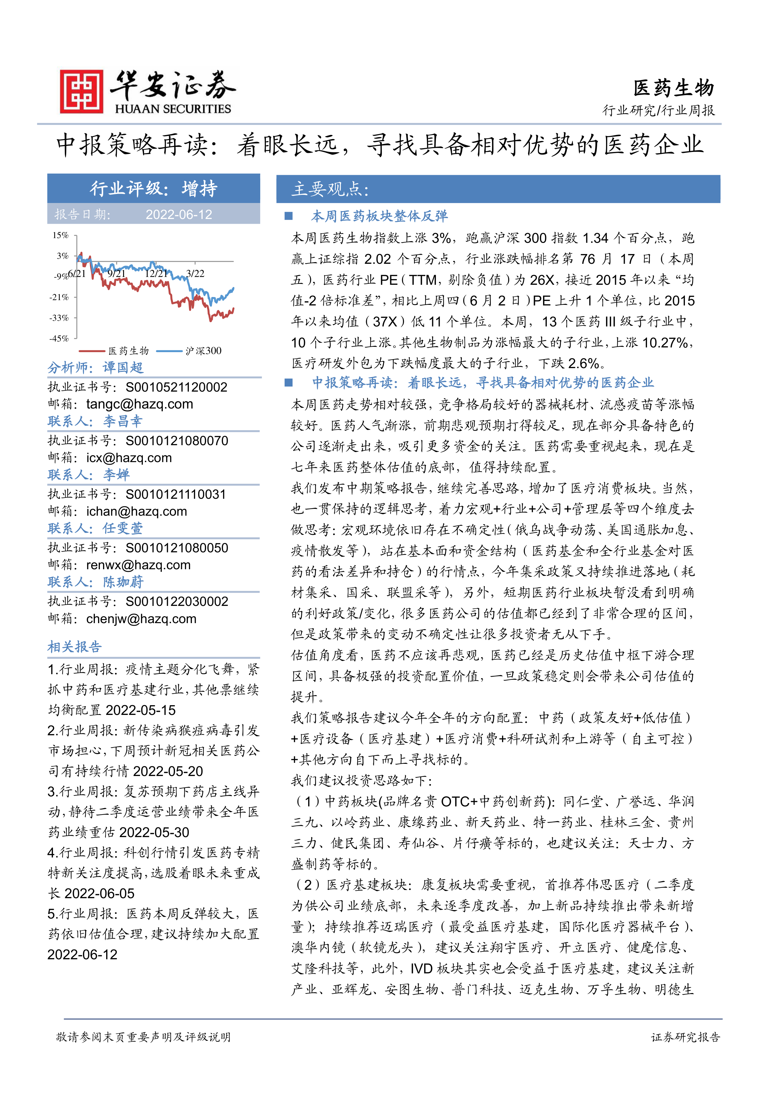 本报告涵盖了本周医药行业行情回顾、中期投资策略、新发报告以及个股表现等方面的内容。