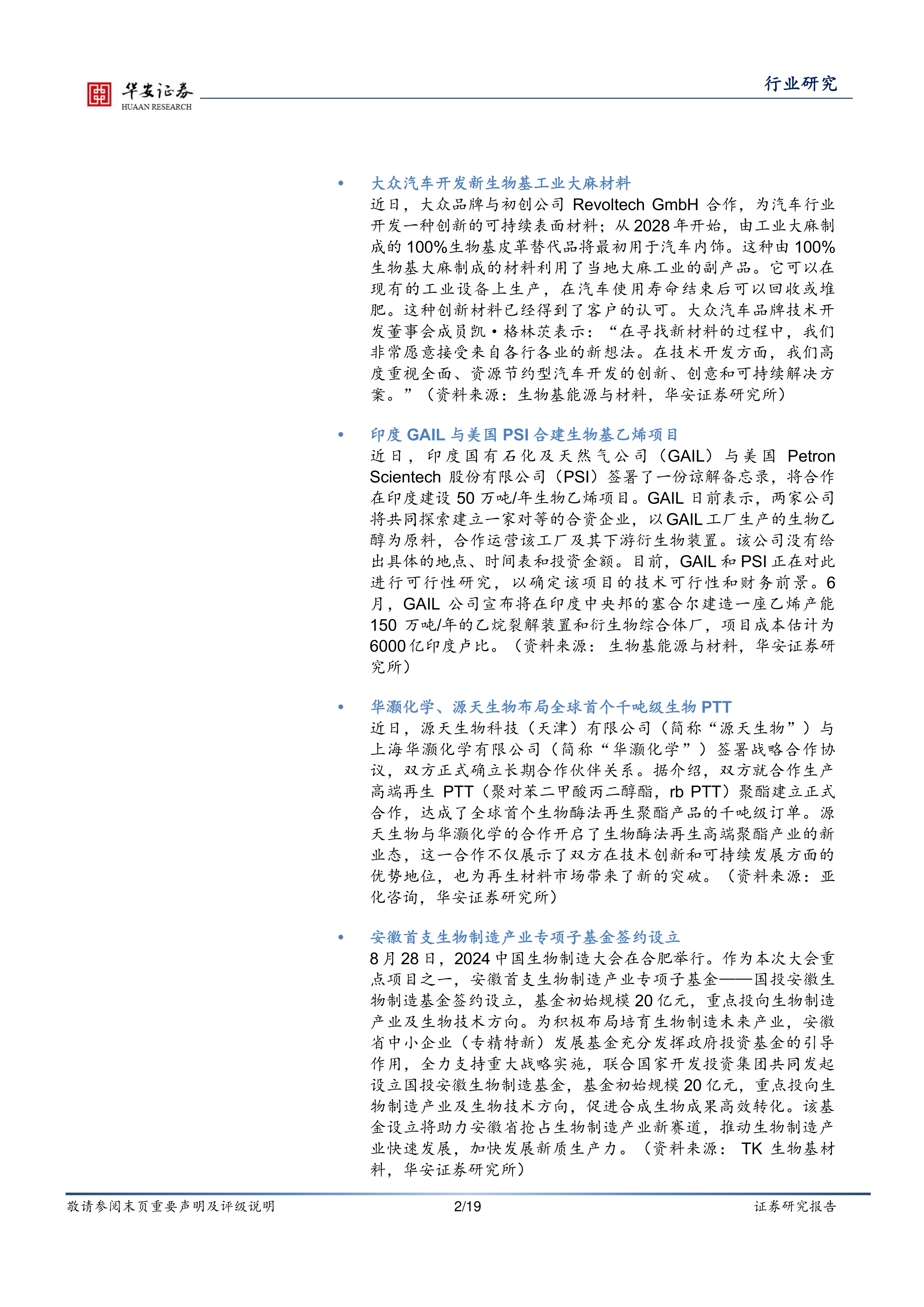 8月28日,2024中国生物制造大会在合肥举行。作为本次大会重点项目之一,安徽首支生物制造产业专项子基金——国投安徽生物制造基金签约设立,基金初始规模20亿元,重点投向生物制造产业及生物技术方向。为积极布局培育生物制造未来产业,安徽省中小企业(专精特新)发展基金充分发挥政府投资基金的引导作用,全力支持重大战略实施,联合国家开发投资集团共同发起设立国投安徽生物制造基金,基金初始规模20亿元,重点投向生物制造产业及生物技术方向,促进合成生物成果高效转化。该基金设立将助力安徽省抢占生物制造产业新赛道,推动生物制造产业快速发展,加快发展新质生产力。(资料来源:TK生物基材料,华安证券研究所)