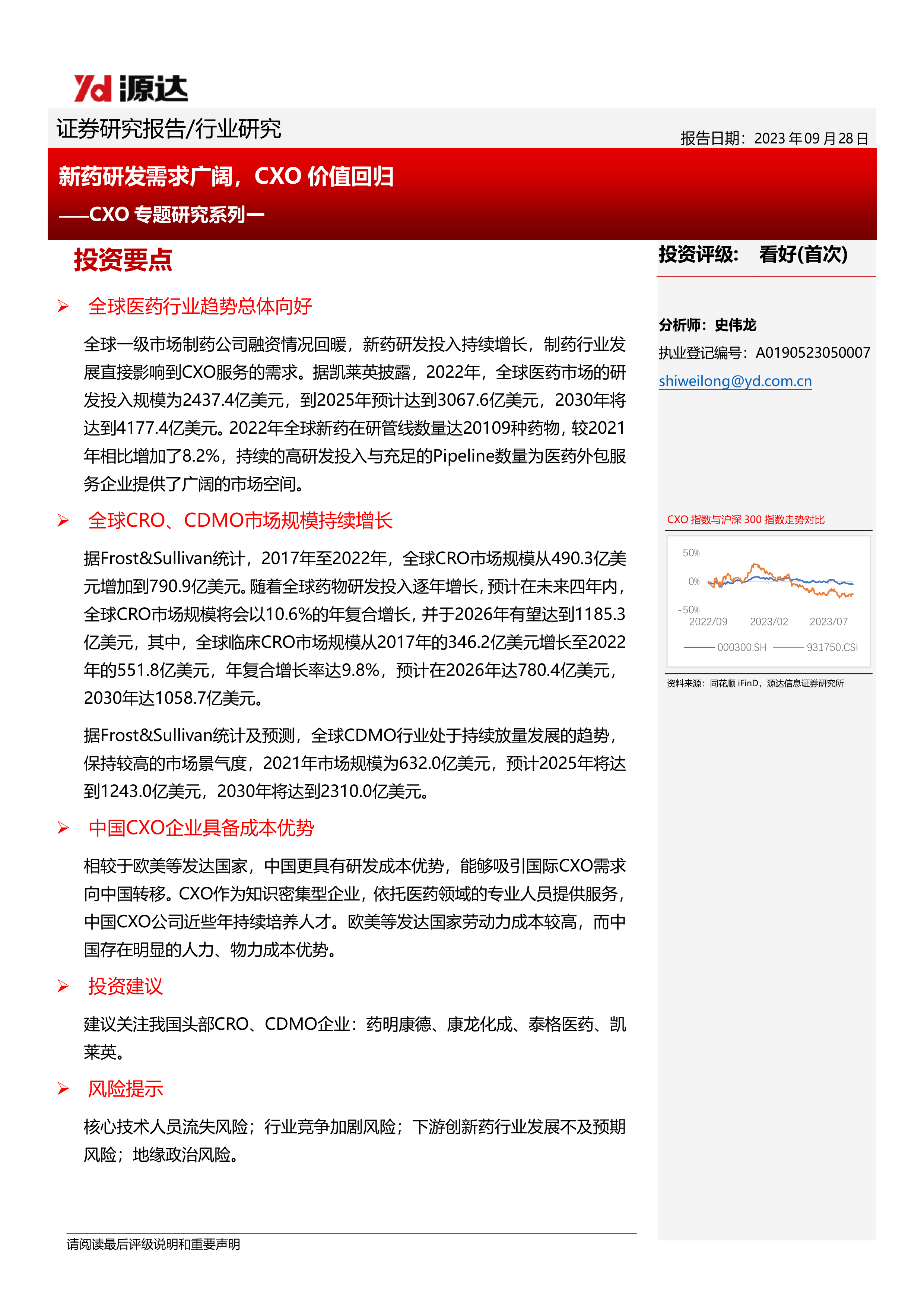 本报告通过对全球和中国CXO市场现状及发展趋势的分析,以及对四家CXO龙头企业的深入研究,得出结论:全球医药行业持续向好,新药研发投入持续增长,为CXO行业提供了广阔的市场空间;中国CXO企业凭借成本优势和不断提升的技术水平,在全球市场中占据越来越重要的地位,具有良好的投资价值。 然而,投资者也需要关注报告中提到的潜在风险。