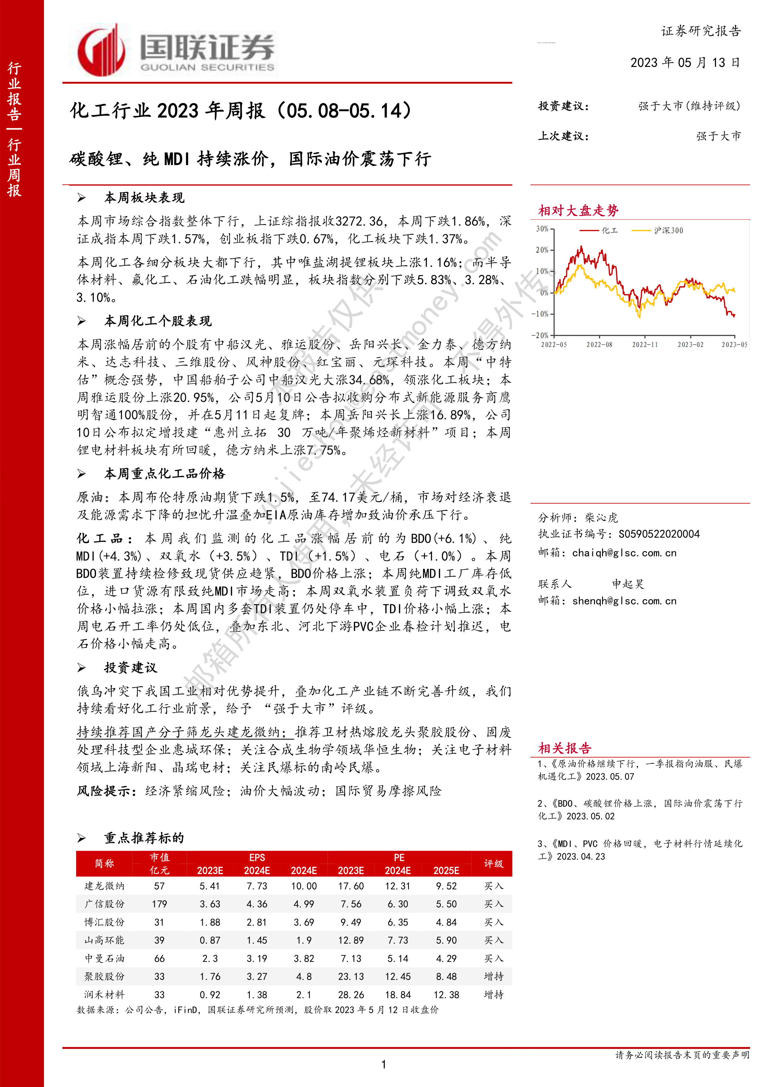 本报告对2023年5月8日至14日期间化工行业市场行情进行了全面分析。 尽管本周市场整体表现低迷,化工板块也受到一定影响,但部分细分领域和个股展现出较强的韧性。 长期来看,俄乌冲突以及我国化工产业链的不断完善升级,为化工行业发展提供了有利条件。 报告维持对化工行业的“强于大市”评级,并推荐了一系列具有不同投资亮点的个股,同时提醒投资者关注潜在的风险因素。 投资者应根据自身情况,谨慎决策。