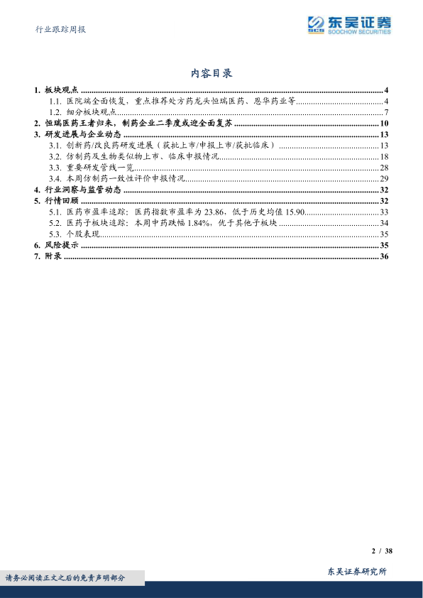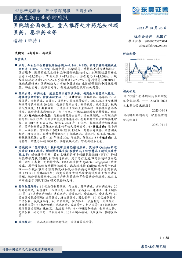 本报告的核心观点是:医院端全面恢复,叠加集采影响减弱、创新药放量等因素,医药行业有望步入稳定增长的新阶段,优质处方药龙头和创新药企业值得重点关注。报告推荐恒瑞医药、恩华药业等优质仿制药龙头,以及百济神州、恒瑞医药等创新药企业。