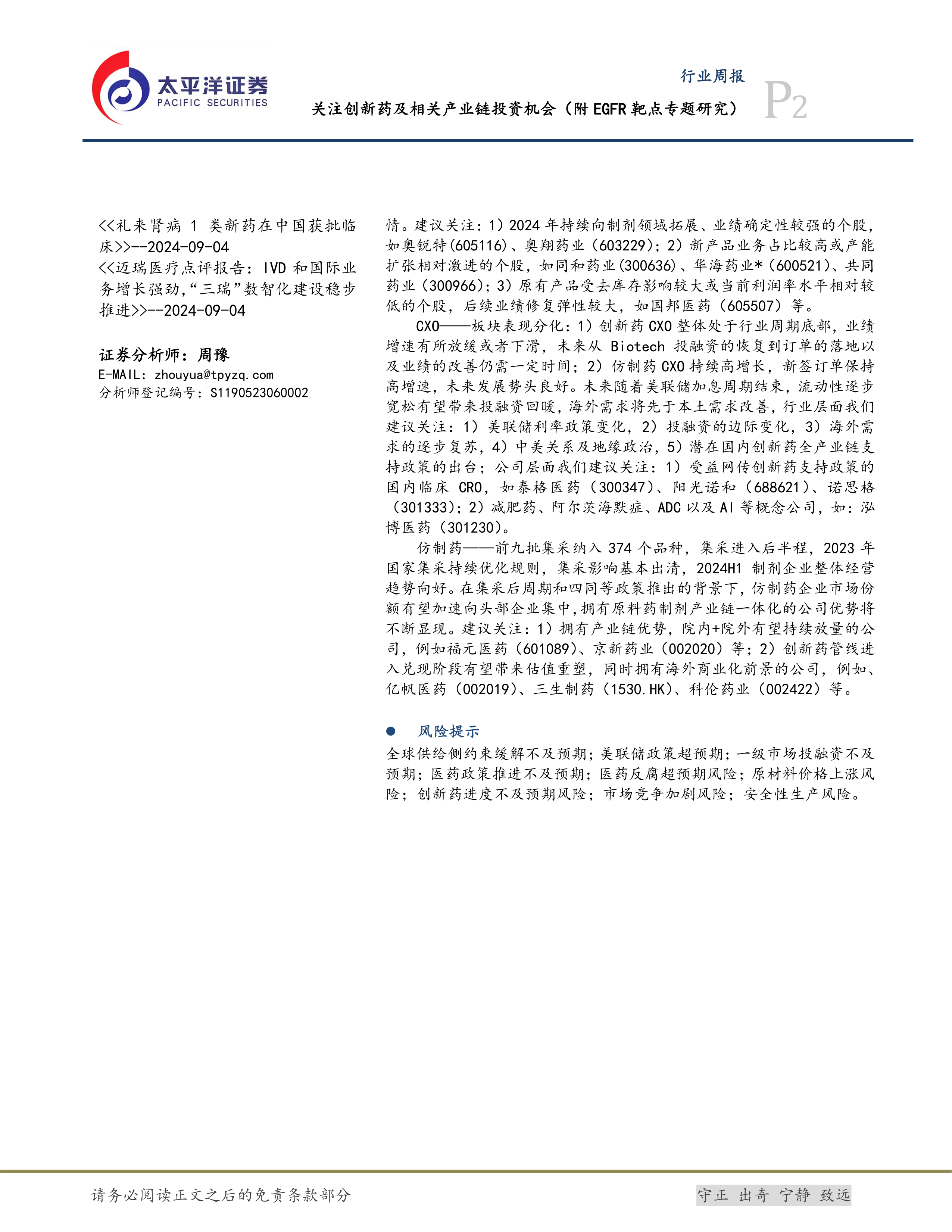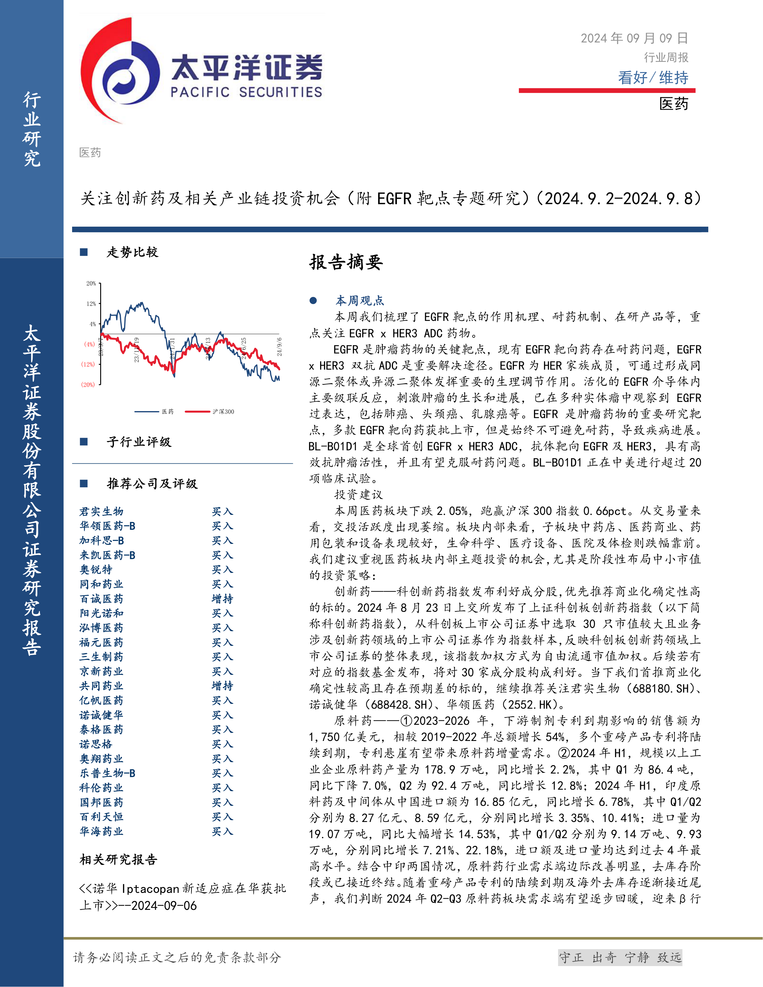 本报告对医药行业,特别是创新药和原料药领域进行了深入分析,指出EGFR靶点新型ADC药物以及科创板创新药指数为投资者提供了新的投资机会。报告同时对行业整体表现、公司动态和行业动态进行了总结,并提示了投资者需要注意的风险因素。 报告中推荐的个股需结合自身风险承受能力和投资策略进行选择,不构成投资建议。