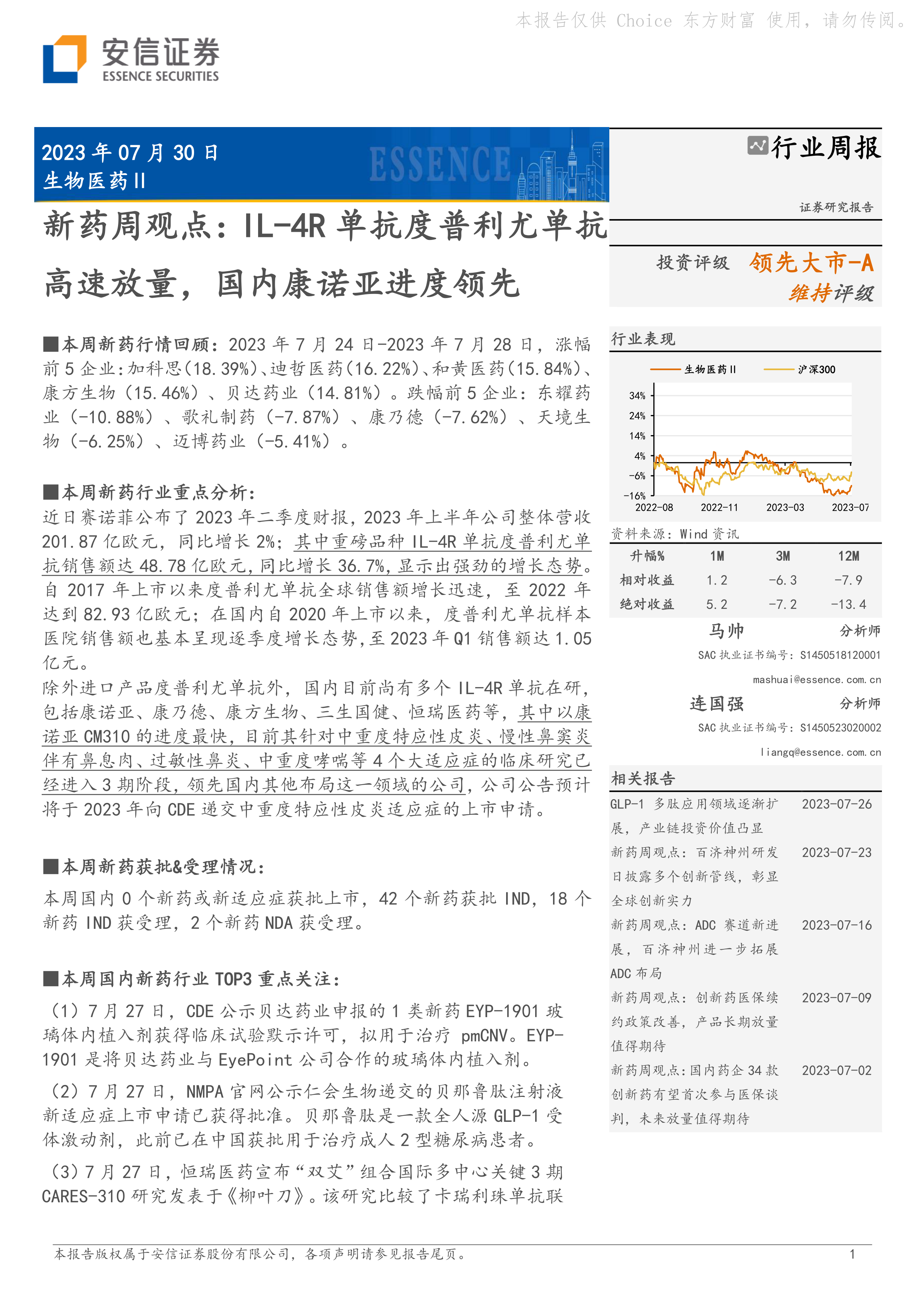 本报告对2023年7月24日至28日一周的生物医药行业,特别是新药领域进行了简要回顾和分析。报告重点关注了IL-4R单抗市场,指出康诺亚CM310在国内的领先地位,并对国内外新药研发进展进行了概述。 然而,报告中数据分析深度不足,对图表数据的解读不够深入,对重点事件的影响分析也较为简略。 建议在未来的报告中,增加更详细的数据分析、更深入的市场分析和更全面的风险评估,以提高报告的专业性和实用性。 此外,报告中部分数据来源说明不够清晰,建议补充更详细的数据来源说明,增强报告的可信度。