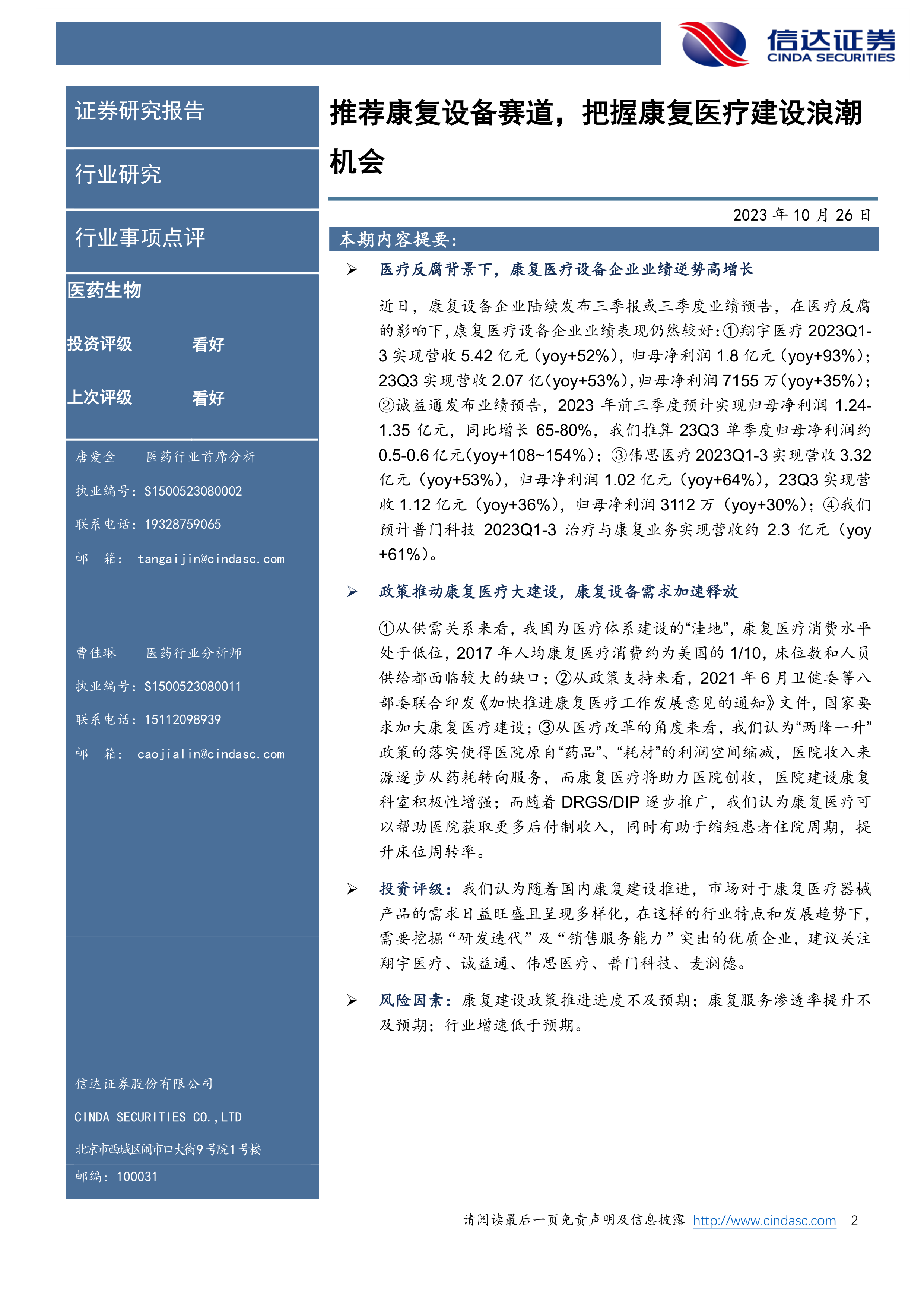 风险因素:康复建设政策推进进度不及预期;康复服务渗透率提升不及预期;行业增速低于预期。