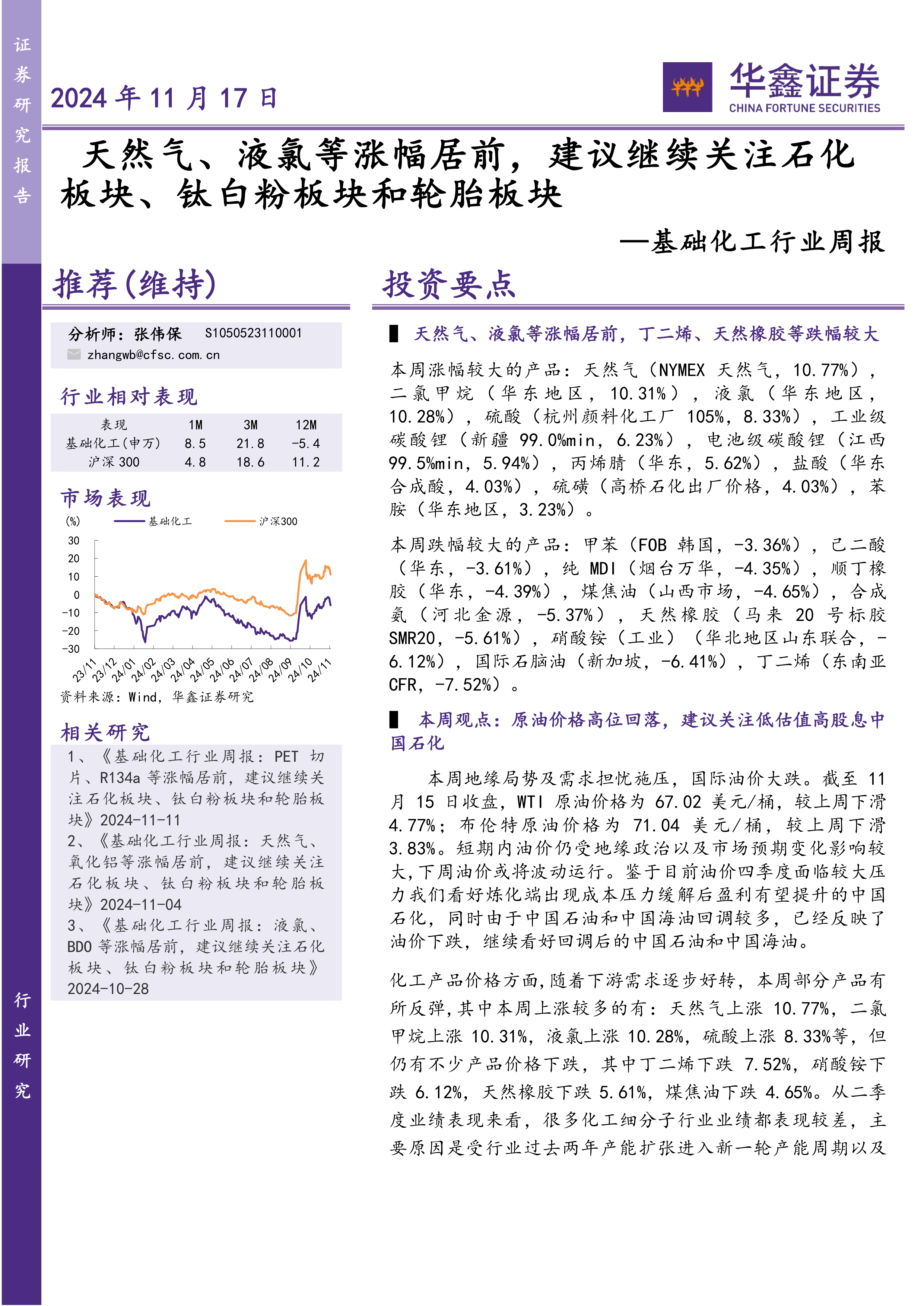 基础化工行业周报:天然气、液氯等涨幅居前,建议继续关注石化板块、钛白粉板块和轮胎板块