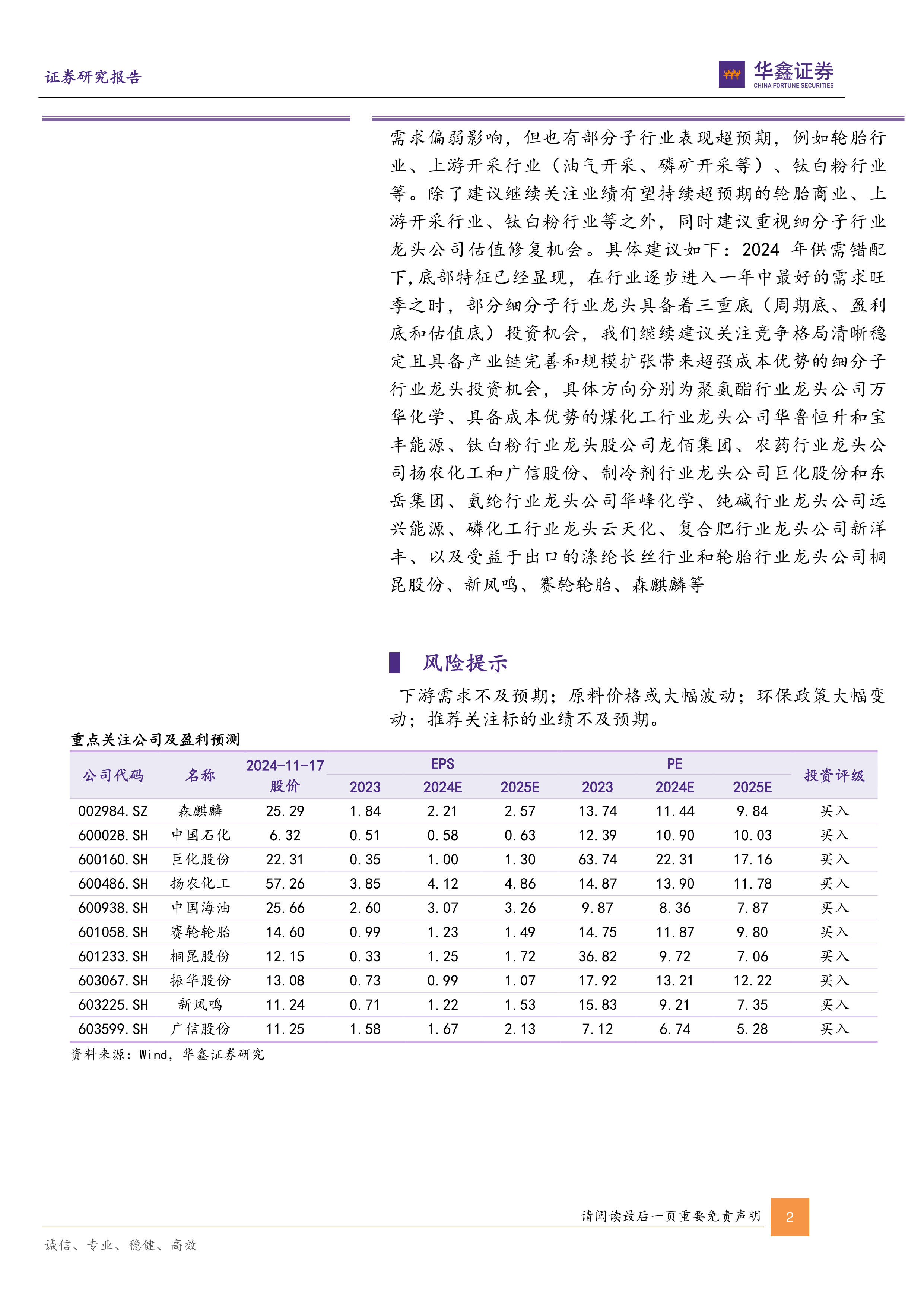 报告建议投资者关注低估值高股息的中国石化,以及在四季度需求旺季来临之际,具备三重底投资机会的细分子行业龙头公司。这些公司在竞争格局清晰稳定,并具备产业链完善和规模扩张带来的成本优势。具体推荐方向包括聚氨酯、煤化工、钛白粉、农药、制冷剂、氨纶、纯碱、磷化工、复合肥以及涤纶长丝和轮胎行业龙头公司。