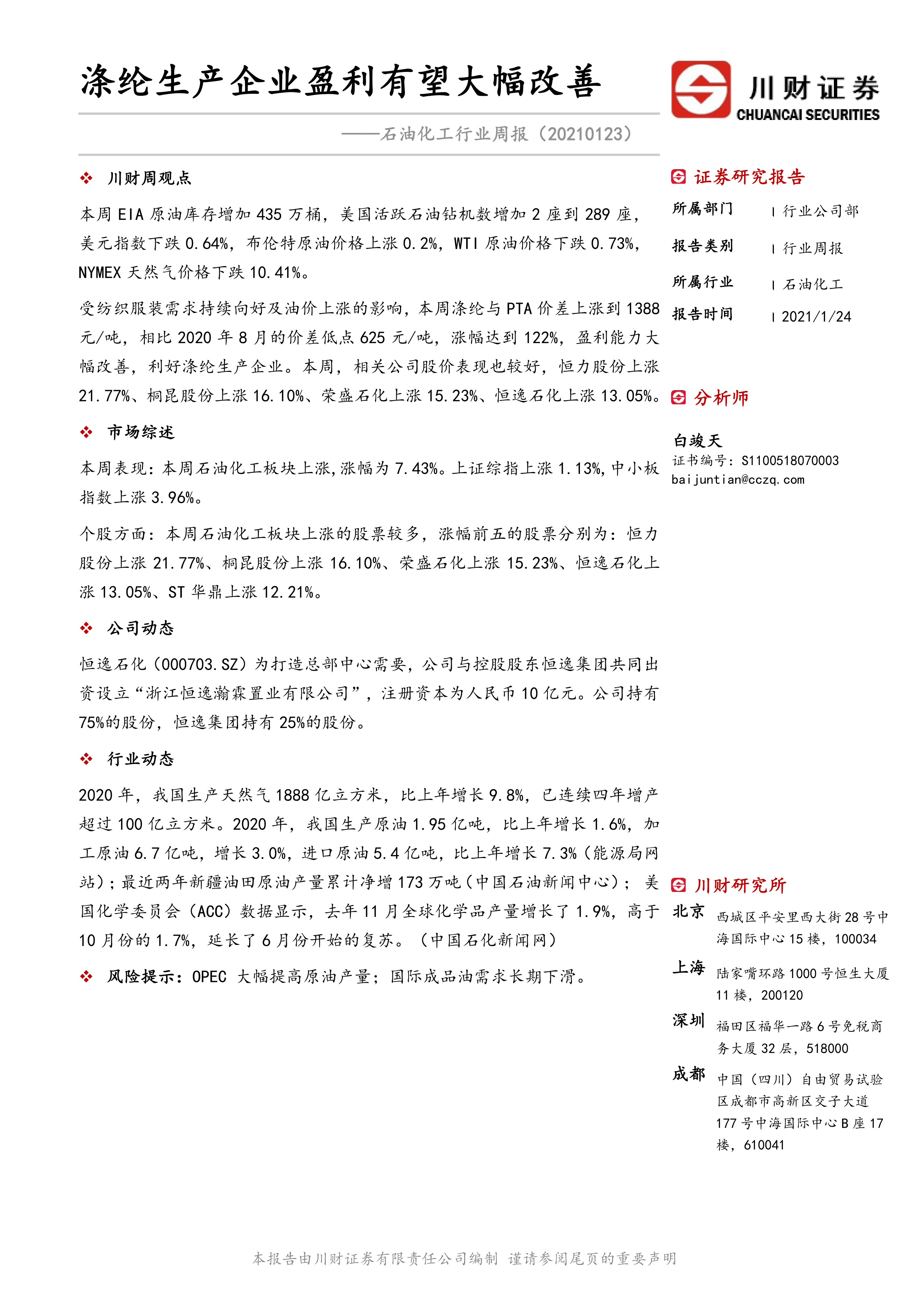 本周表现: 本周石油化工板块上涨,涨幅为 7.43%。上证综指上涨 1.13%,中小板指数上涨 3.96%。