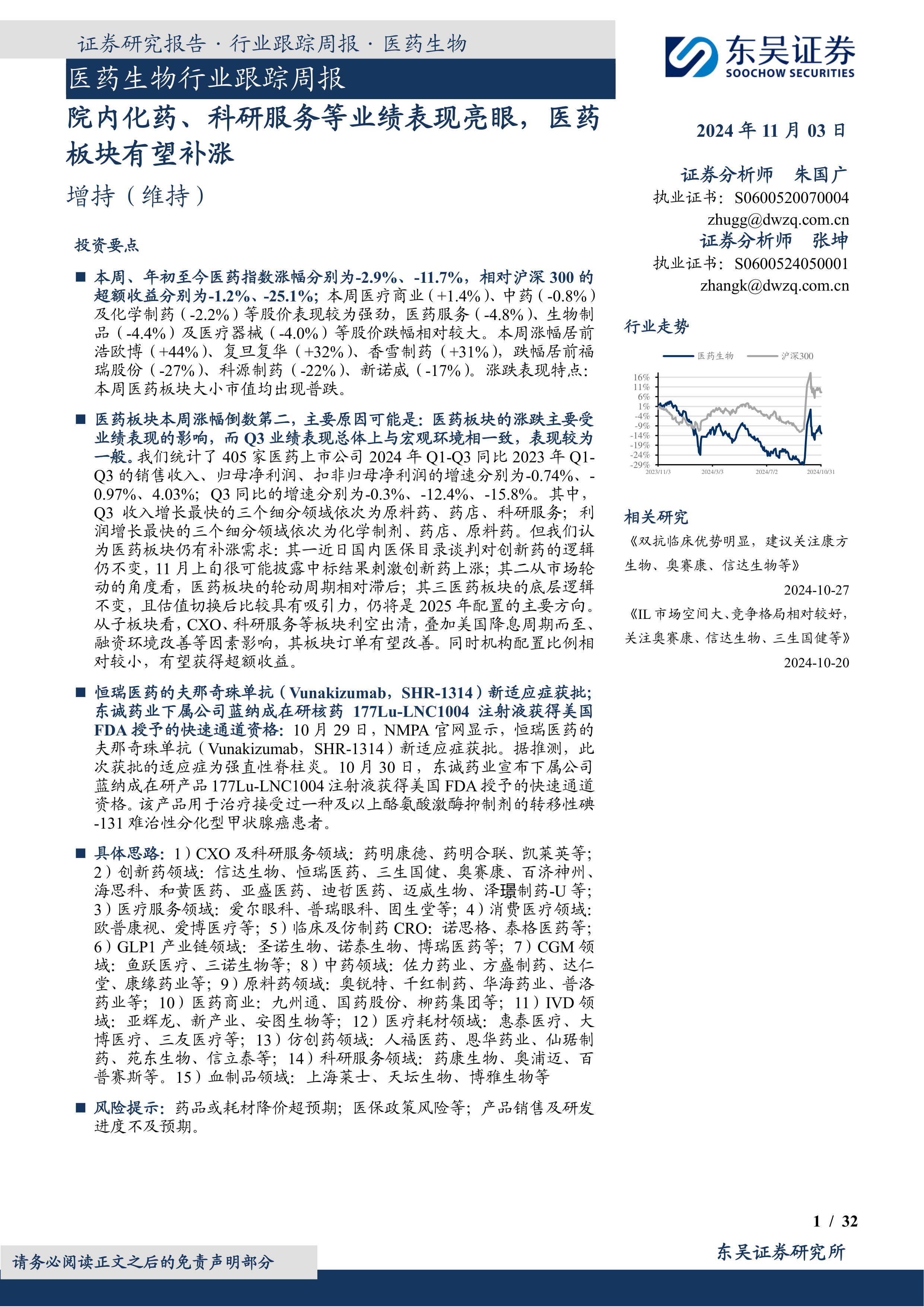 本报告的核心观点是:尽管2024年Q3医药板块整体业绩表现一般,与宏观环境相符,但仍存在补涨需求。院内化药和科研服务等细分领域业绩亮眼,利空出清,且估值切换后具有吸引力,未来有望获得超额收益。报告建议关注CXO、科研服务、创新药等领域,并提示了药品降价、医保政策等风险。