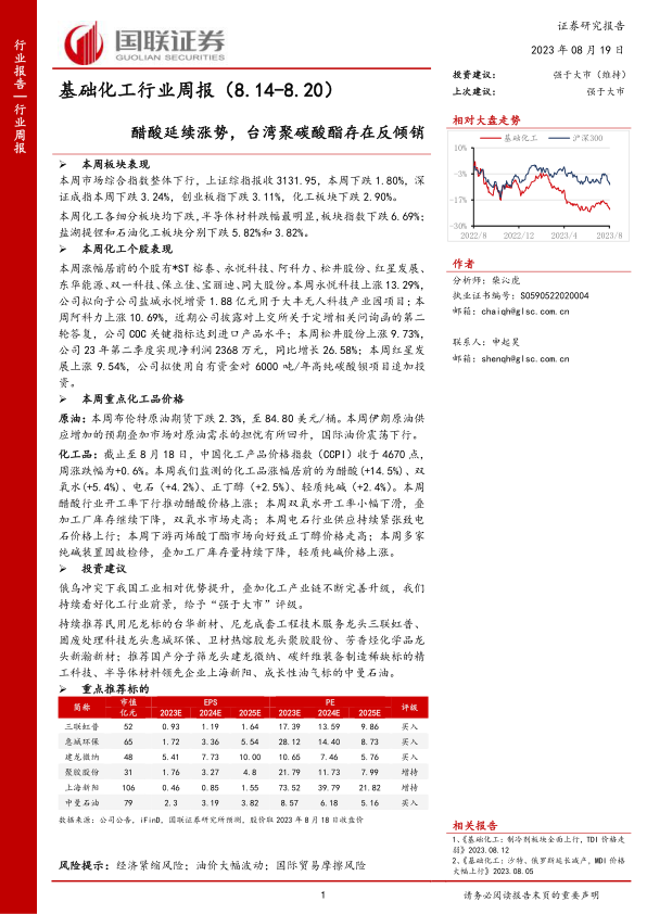 基础化工行业周报:醋酸延续涨势,台湾聚碳酸酯存在反倾销