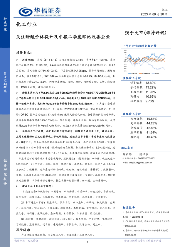 本报告对近期油价走势进行了详细分析,指出本周油价环比下降2.3%左右,但全年价格中枢预计在80美元/桶,8月油价震荡偏强。油价下行趋势将提升炼化盈利能力,醋酸景气度快速上升。