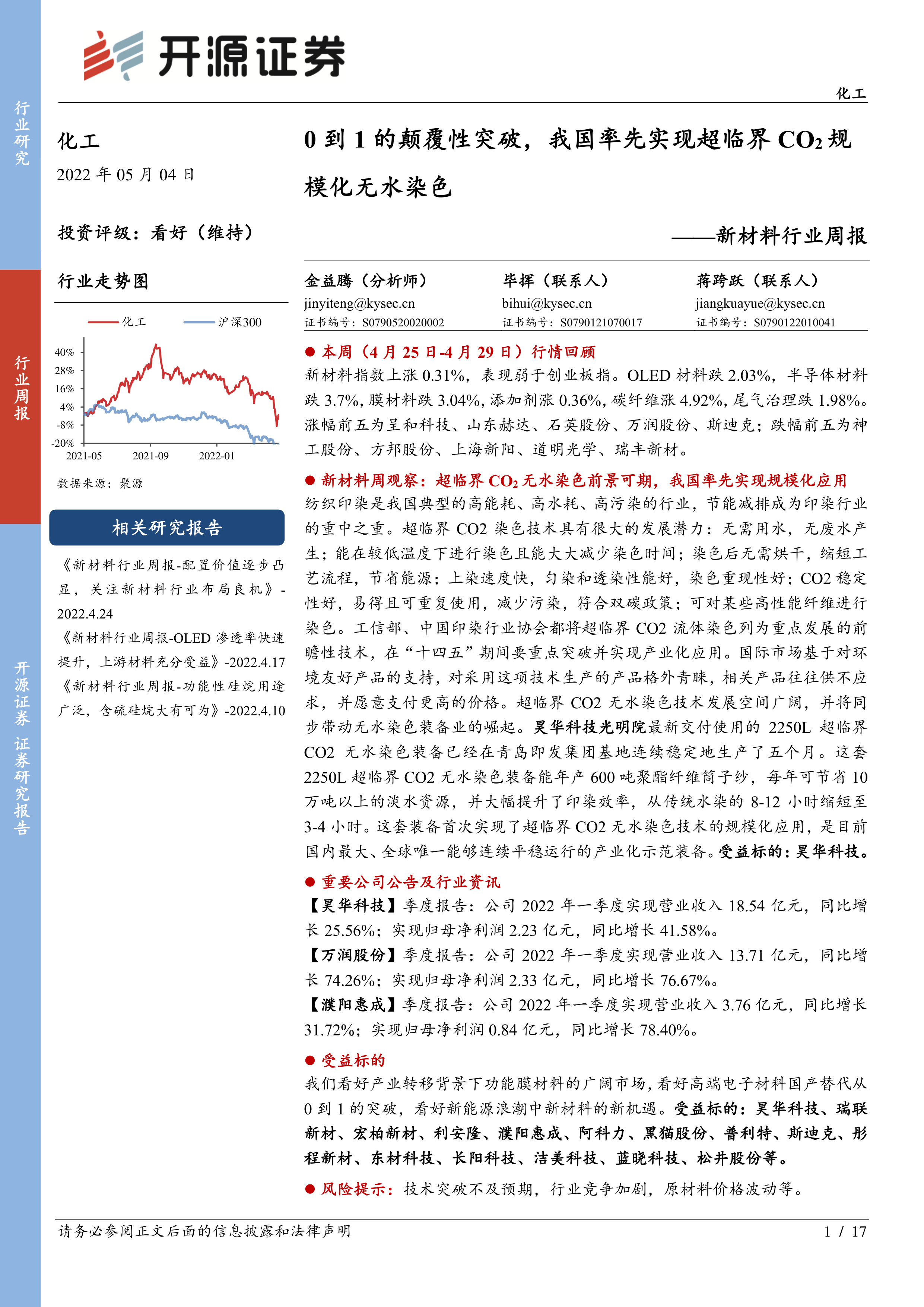 新材料行业周报:0到1的颠覆性突破,我国率先实现超临界CO2规模化无水染色