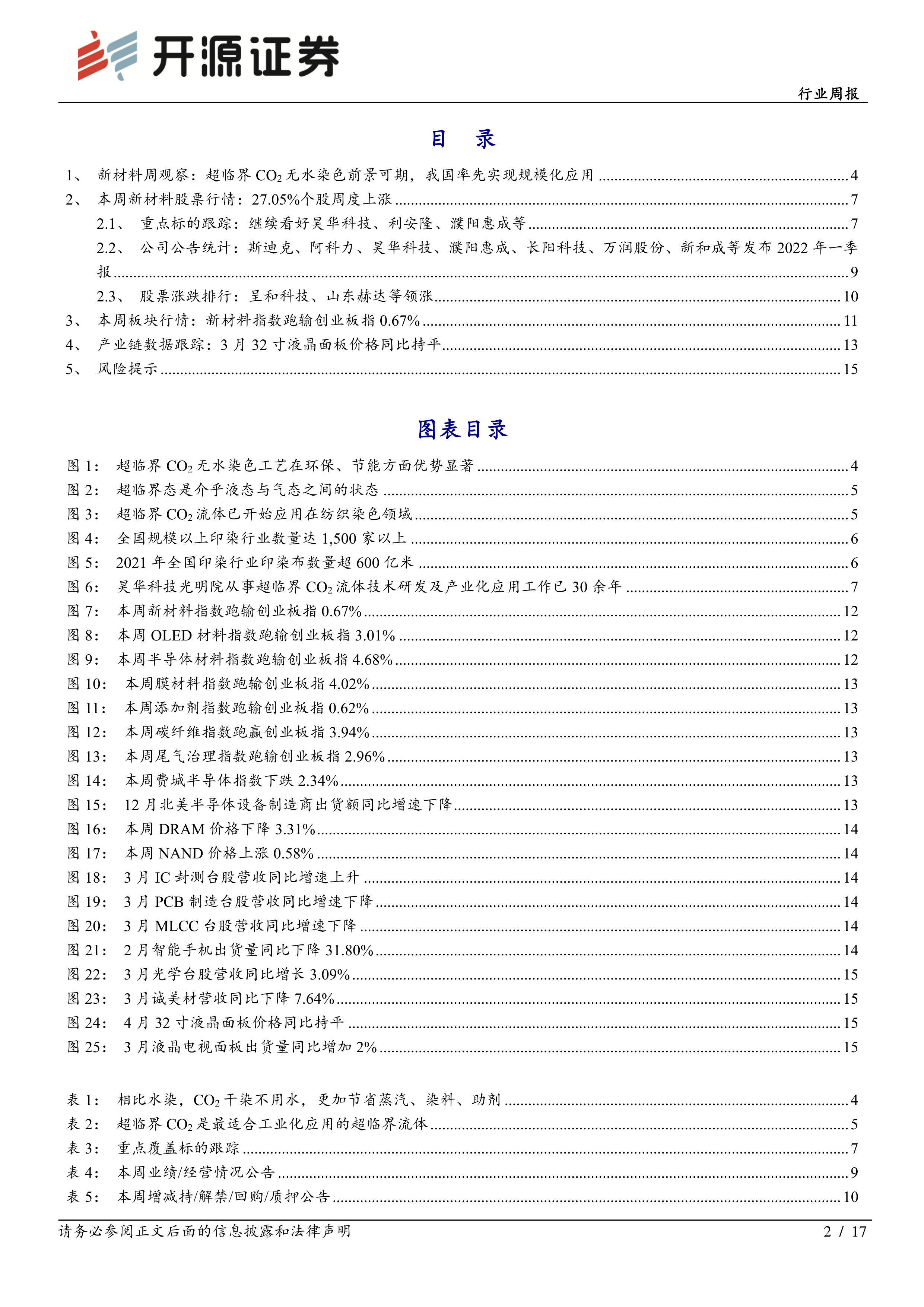 本报告的核心观点是:超临界CO₂无水染色技术作为一种具有颠覆性的环保型纺织染色技术,在我国率先实现了规模化应用,具有广阔的市场前景。报告通过数据分析,展现了该技术在节能减排、提高效率方面的显著优势,并指出昊华科技在该领域的领先地位及其带来的投资机会。同时,报告也对新材料行业整体市场走势进行了分析,并列举了其他值得关注的受益标的。