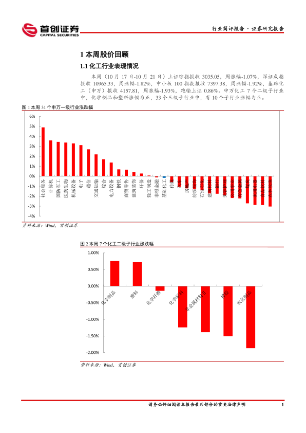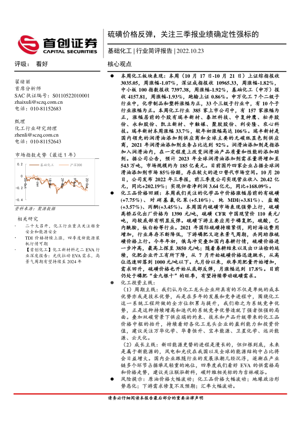 本报告的核心观点是:本周(10月17日-10月21日)化工行业整体表现弱于大盘,但部分细分领域和个股表现强劲。硫磺价格强势反弹,部分化工品价格上涨,反映出市场需求回暖和供需格局的变化。投资方面,建议关注具备系统竞争优势的化工龙头企业以及受益于新能源发展的成长性公司。