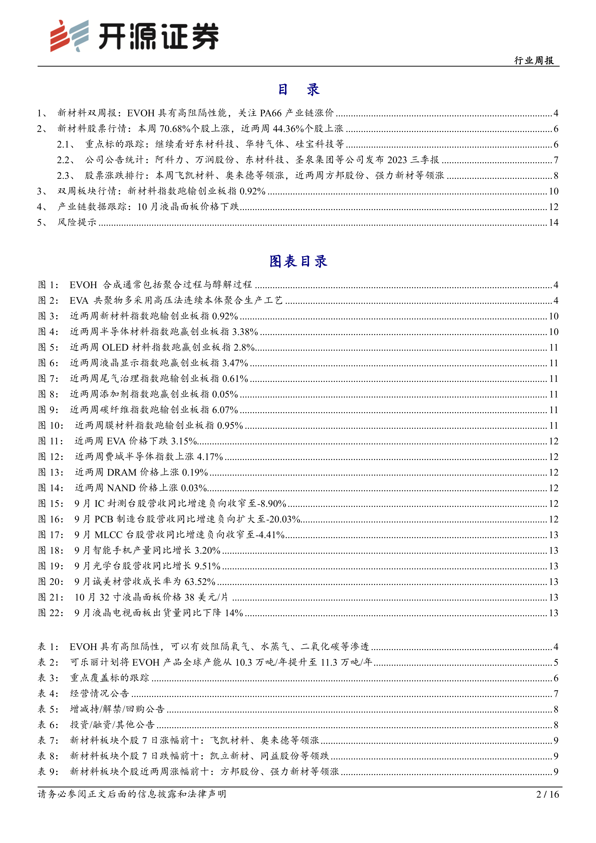 本报告的核心观点是:新材料行业近期表现略逊于创业板指数,但部分细分领域如半导体材料、OLED材料和液晶显示材料表现强劲。EVOH(乙烯-乙烯醇共聚物)因其优异的阻隔性能受到关注,主要生产商正积极扩产。PA66产业链相关产品涨价,主要厂商关闭或计划关闭部分工厂,这将对市场供应和价格产生影响。