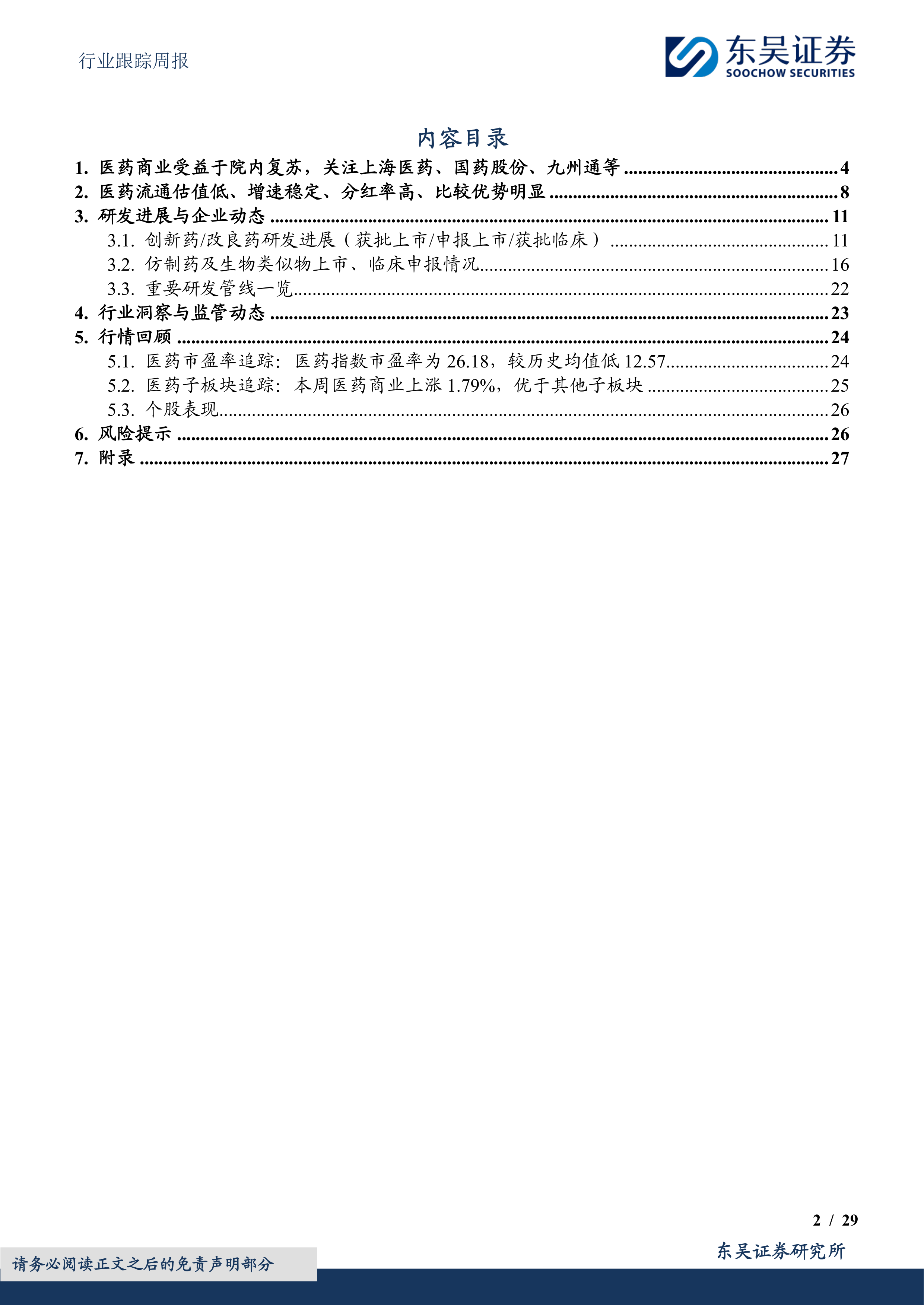 本报告基于公开数据,对医药生物行业,特别是医药商业板块进行了深入分析。报告指出,院内处方药市场复苏是驱动医药商业板块增长的主要因素,而低估值、稳定增长和高分红率是该板块的显著优势。报告还对创新药、CRO等多个细分领域进行了分析,并提出了多元化的投资策略和具体的投资建议。 然而,投资者仍需关注药品降价、医保政策以及研发进度等潜在风险。 本报告仅供参考,不构成投资建议。