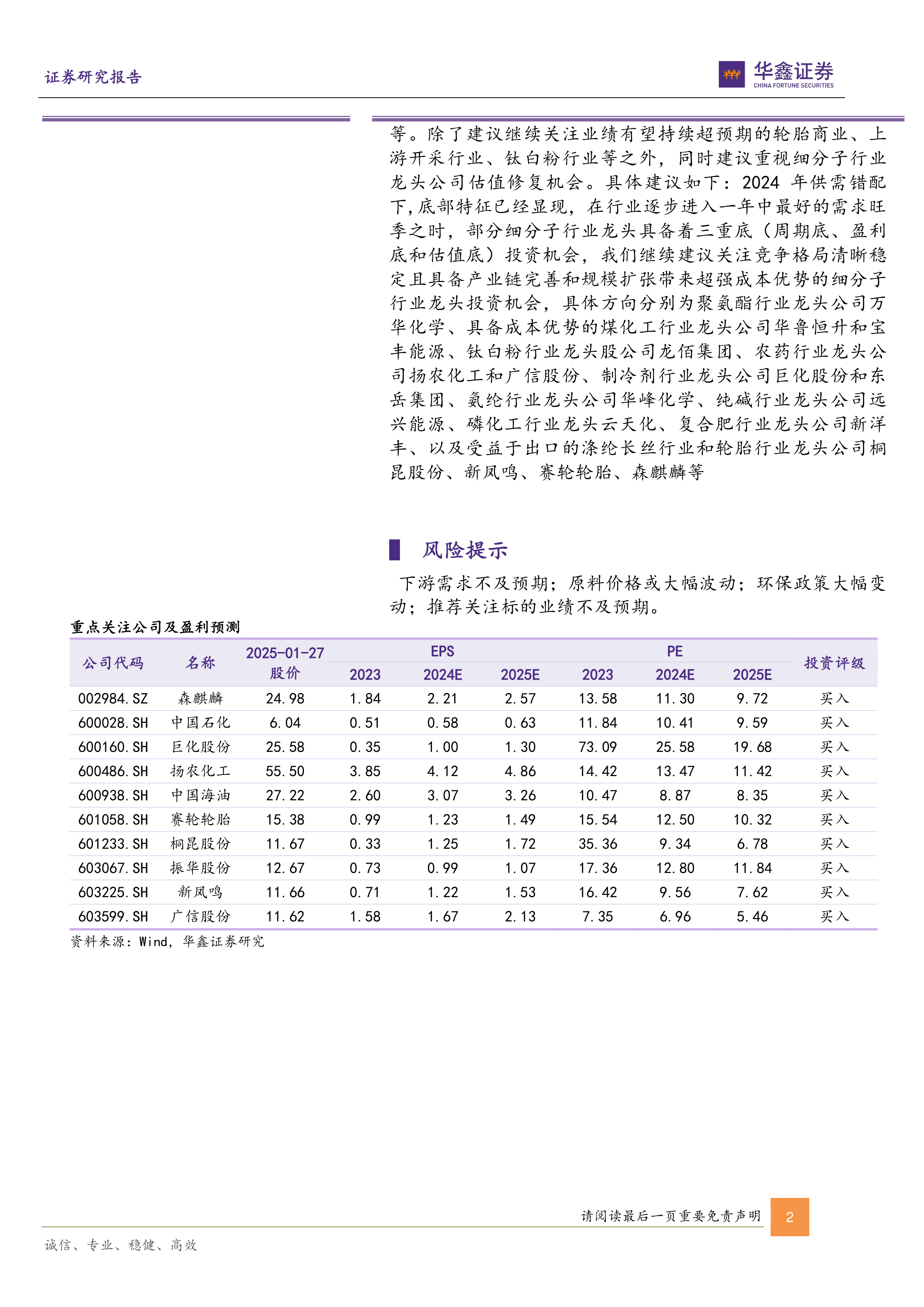化工产品价格方面,随着下游需求逐步好转,本周部分产品有所反弹,其中本周上涨较多的有:丙烯腈上涨7.34%,煤焦油上涨7.04%,丁二烯上涨6.30%,R134a上涨4.76%等,但仍有不少产品价格下跌,其中赖氨酸下跌4.55%,磷酸二铵下跌7.07%,合成氨下跌7.60%,二氯甲烷下跌7.74%。从三季度业绩表现来看,很多化工细分子行业业绩都表现较差,主要原因是受行业过去两年产能扩张进入新一轮产能周期以及需求偏弱影响,但也有部分子行业表现超预期,例如轮胎行业、上游开采行业(油气开采、磷矿开采等)、钛白粉行业等。除了建议继续关注业绩有望持续超预期的轮胎商业、上游开采行业、钛白粉行业等之外,同时建议重视细分子行业龙头公司估值修复机会。具体建议如下:2024年供需错配下,底部特征已经显现,在行业逐步进入一年中最好的需求旺季之时,部分细分子行业龙头具备着三重底(周期底、盈利底和估值底)投资机会,我们继续建议关注竞争格局清晰稳定且具备产业链完善和规模扩张带来超强成本优势的细分子行业龙头投资机会,具体方向分别为聚氨酯行业龙头公司万华化学、具备成本优势的煤化工行业龙头公司华鲁恒升和宝丰能源、钛白粉行业龙头股公司龙佰集团、农药行业龙头公司扬农化工和广信股份、制冷剂行业龙头公司巨化股份和东岳集团、氨纶行业龙头公司华峰化学、纯碱行业龙头公司远兴能源、磷化工行业龙头云天化、复合肥行业龙头公司新洋丰、以及受益于出口的涤纶长丝行业和轮胎行业龙头公司桐昆股份、新凤鸣、赛轮轮胎、森麒麟等