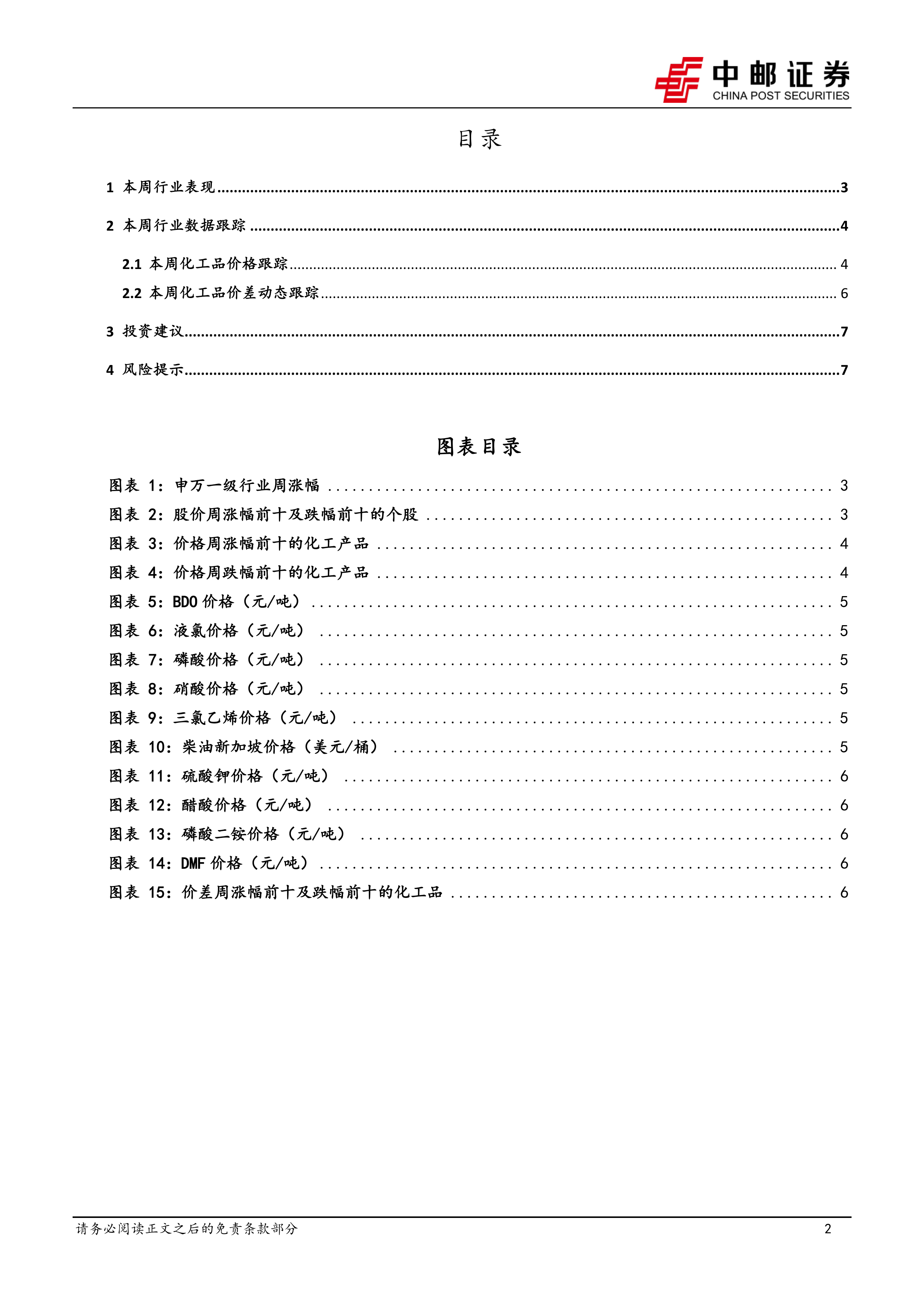 本周行业数据跟踪:本周化工品价格涨幅前五的为BDO(27.40%)、液氯(18.52%)、磷酸(15.79%)、硝酸(14.29%)、三氯乙烯(12.23%);价格跌幅前五的为柴油新加坡(-12.45%)、硫酸钾(-13.69%)、醋酸(-6.45%)、磷酸二铵(-6.31%)、DMF(-4.76%)。本周化工品价差涨幅前五的为己二酸-纯苯价差(23.03%)、PVA-醋酸乙烯价差(21.51%)、磷酸-磷矿石价差(19.93%)、黄磷-磷矿石价差(11.21%)、涤纶-PTA价差(6.11%),价差跌幅前五的为R134a-三氯乙烯价差(-250.75%)、三聚磷酸钠-磷酸价差(-75.24%)、PVC-电石价差(-35.45%)、醋酸-甲醇价差(-13.27%)、DMF-甲醇价差(-10.36%)。