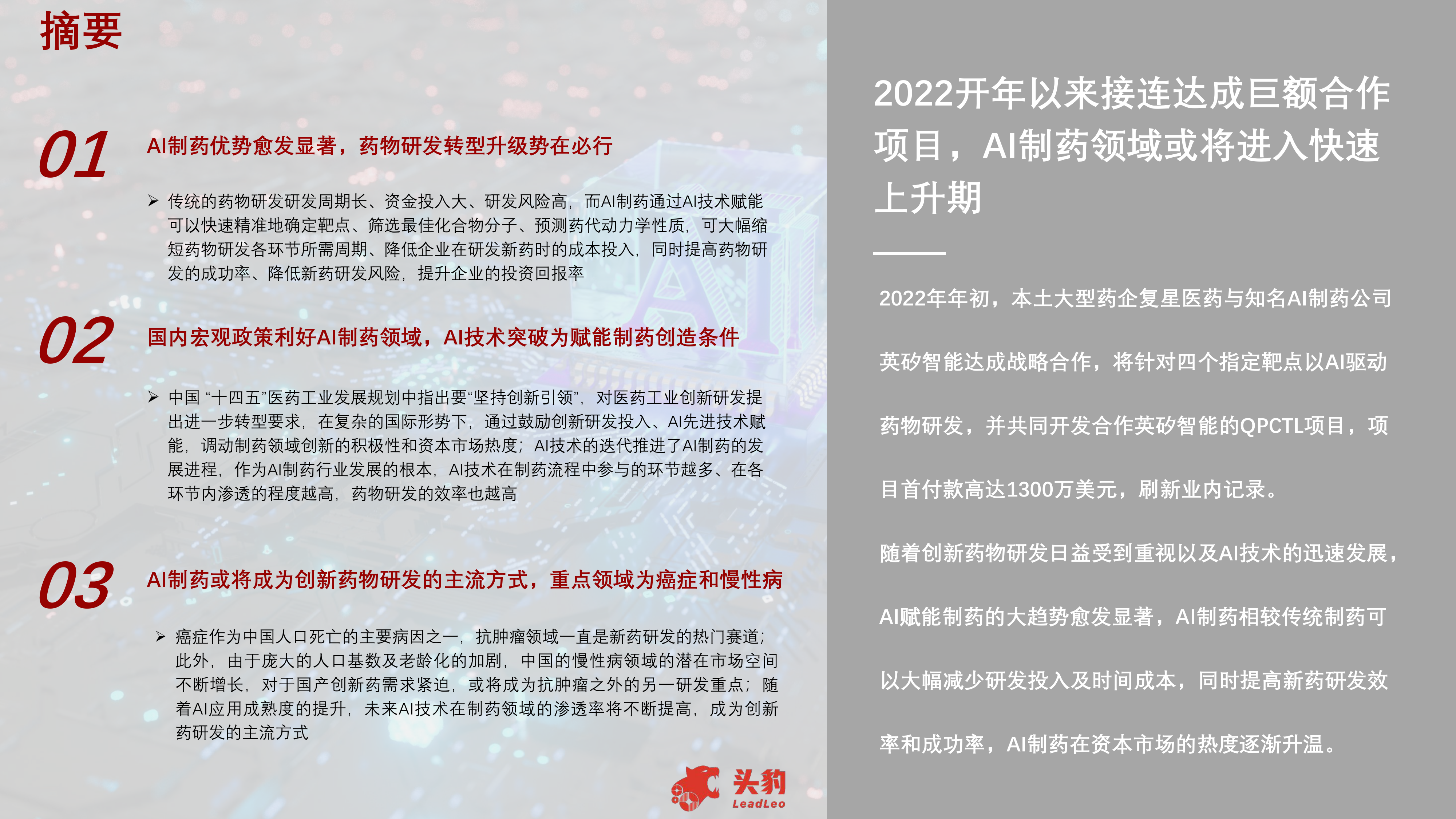 本报告的核心观点是:AI制药行业正处于快速上升期,其优势在于显著缩短药物研发周期、降低成本、提高成功率。中国AI制药市场潜力巨大,驱动因素包括利好政策、持续升温的投融资以及AI技术的突破。未来,AI制药将成为创新药物研发的主流方式,重点领域为癌症和慢性病,领先企业将拓展更完整的业务链和多元化商业模式。