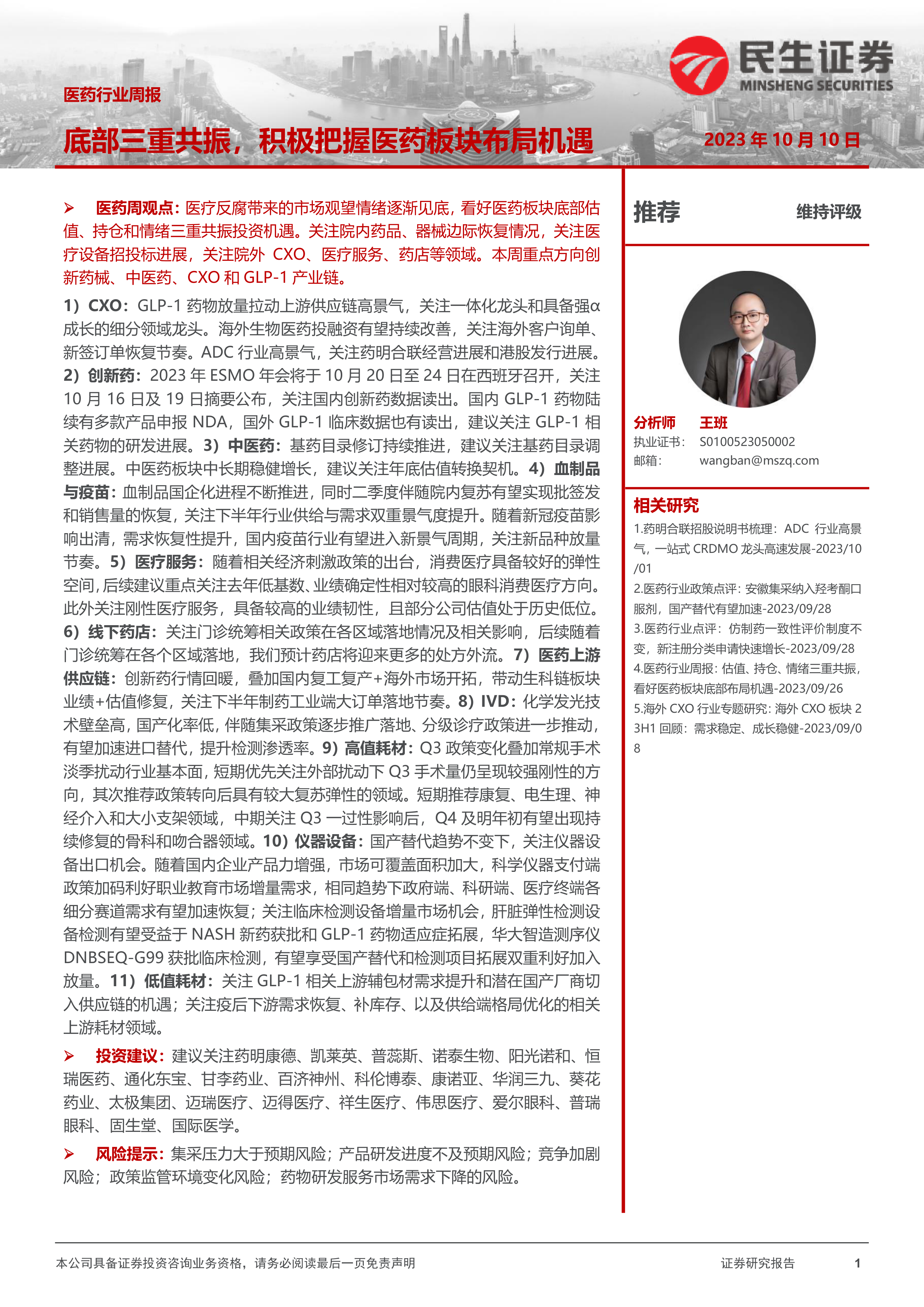 1) CXO: GLP-1 药物放量拉动上游供应链高景气,关注一体化龙头和具备强α成长的细分领域龙头。海外生物医药投融资有望持续改善,关注海外客户询单、新签订单恢复节奏。 ADC 行业高景气,关注药明合联经营进展和港股发行进展。2)创新药: 2023 年 ESMO 年会将于 10 月 20 日至 24 日在西班牙召开,关注10 月 16 日及 19 日摘要公布,关注国内创新药数据读出。国内 GLP-1 药物陆续有多款产品申报 NDA,国外 GLP-1 临床数据也有读出,建议关注 GLP-1 相关药物的研发进展。 3)中医药: 基药目录修订持续推进,建议关注基药目录调整进展。中医药板块中长期稳健增长,建议关注年底估值转换契机。 4)血制品与疫苗: 血制品国企化进程不断推进,同时二季度伴随院内复苏有望实现批签发和销售量的恢复,关注下半年行业供给与需求双重景气度提升。随着新冠疫苗影响出清,需求恢复性提升,国内疫苗行业有望进入新景气周期,关注新品种放量节奏。 5)医疗服务: 随着相关经济刺激政策的出台,消费医疗具备较好的弹性空间,后续建议重点关注去年低基数、业绩确定性相对较高的眼科消费医疗方向。此外关注刚性医疗服务,具备较高的业绩韧性,且部分公司估值处于历史低位。6)线下药店: 关注门诊统筹相关政策在各区域落地情况及相关影响,后续随着门诊统筹在各个区域落地,我们预计药店将迎来更多的处方外流。 7)医药上游供应链: 创新药行情回暖,叠加国内复工复产+海外市场开拓,带动生科链板块业绩+估值修复,关注下半年制药工业端大订单落地节奏。 8) IVD: 化学发光技术壁垒高,国产化率低,伴随集采政策逐步推广落地、分级诊疗政策进一步推动,有望加速进口替代,提升检测渗透率。 9)高值耗材: Q3 政策变化叠加常规手术淡季扰动行业基本面,短期优先关注外部扰动下 Q3 手术量仍呈现较强刚性的方向,其次推荐政策转向后具有较大复苏弹性的领域。短期推荐康复、电生理、神经介入和大小支架领域,中期关注 Q3 一过性影响后, Q4 及明年初有望出现持续修复的骨科和吻合器领域。 10)仪器设备: 国产替代趋势不变下,关注仪器设备出口机会。随着国内企业产品力增强,市场可覆盖面积加大,科学仪器支付端政策加码利好职业教育市场增量需求,相同趋势下政府端、科研端、医疗终端各细分赛道需求有望加速恢复;关注临床检测设备增量市场机会,肝脏弹性检测设备检测有望受益于 NASH 新药获批和 GLP-1 药物适应症拓展,华大智造测序仪DNBSEQ-G99 获批临床检测,有望享受国产替代和检测项目拓展双重利好加入放量。 11)低值耗材: 关注 GLP-1 相关上游辅包材需求提升和潜在国产厂商切入供应链的机遇;关注疫后下游需求恢复、补库存、以及供给端格局优化的相关上游耗材领域。