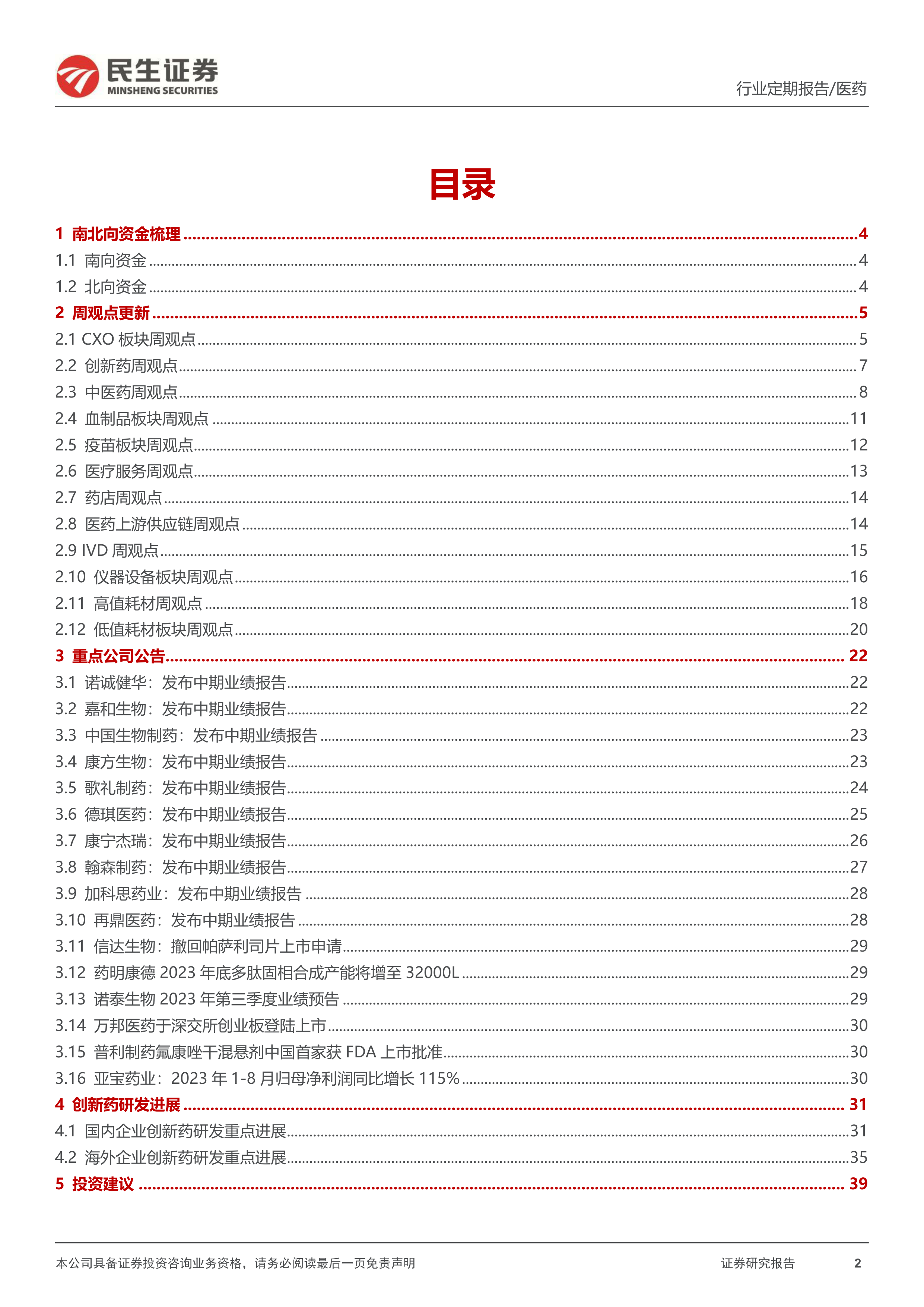 报告对CXO、创新药、中医药、血制品与疫苗、医疗服务、线下药店、医药上游供应链、IVD、高值耗材、仪器设备和低值耗材等十一个细分领域进行了详细的分析,并分别给出了投资建议。