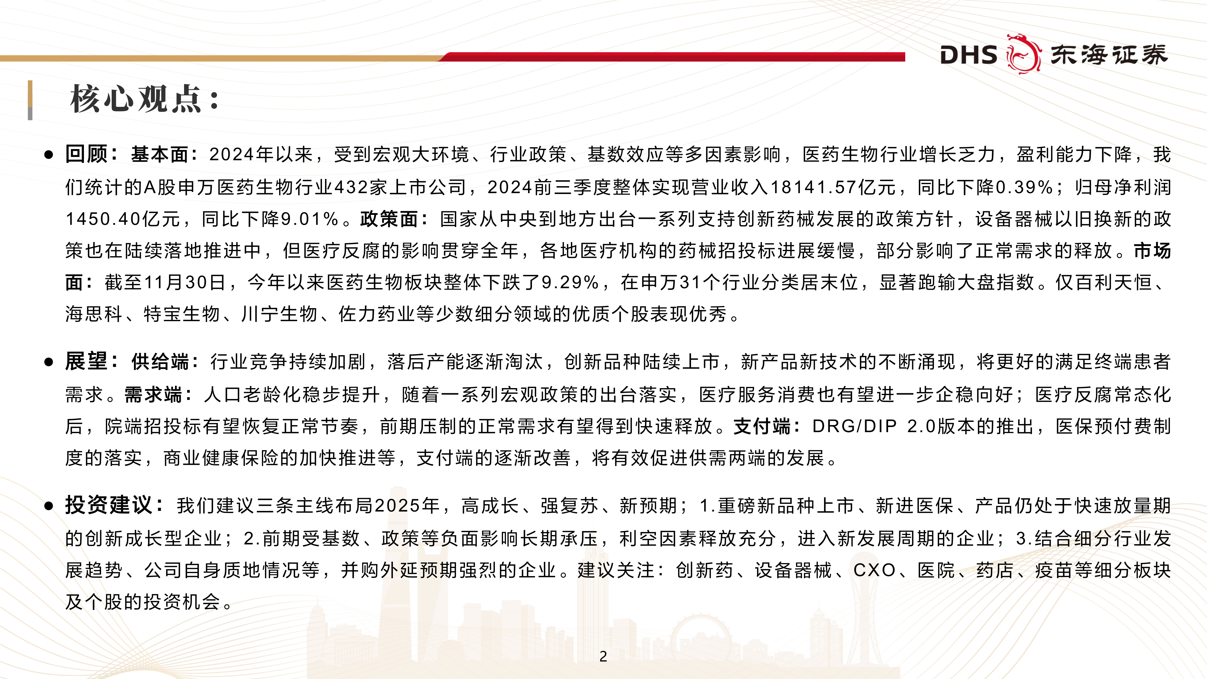 本报告的核心观点是:2024年A股医药生物行业整体表现疲软,但长期增长潜力依然巨大。短期内,宏观环境、医疗反腐、集采政策等因素导致行业增长乏力,盈利能力下降,板块整体跑输大盘。然而,长期来看,人口老龄化、慢性病高发、创新药械发展以及政策支持等因素将推动行业复苏。因此,建议投资者关注具备高成长性、强复苏能力和新预期的企业,重点布局创新药、医疗器械、CXO、医院、药店和疫苗等细分板块。