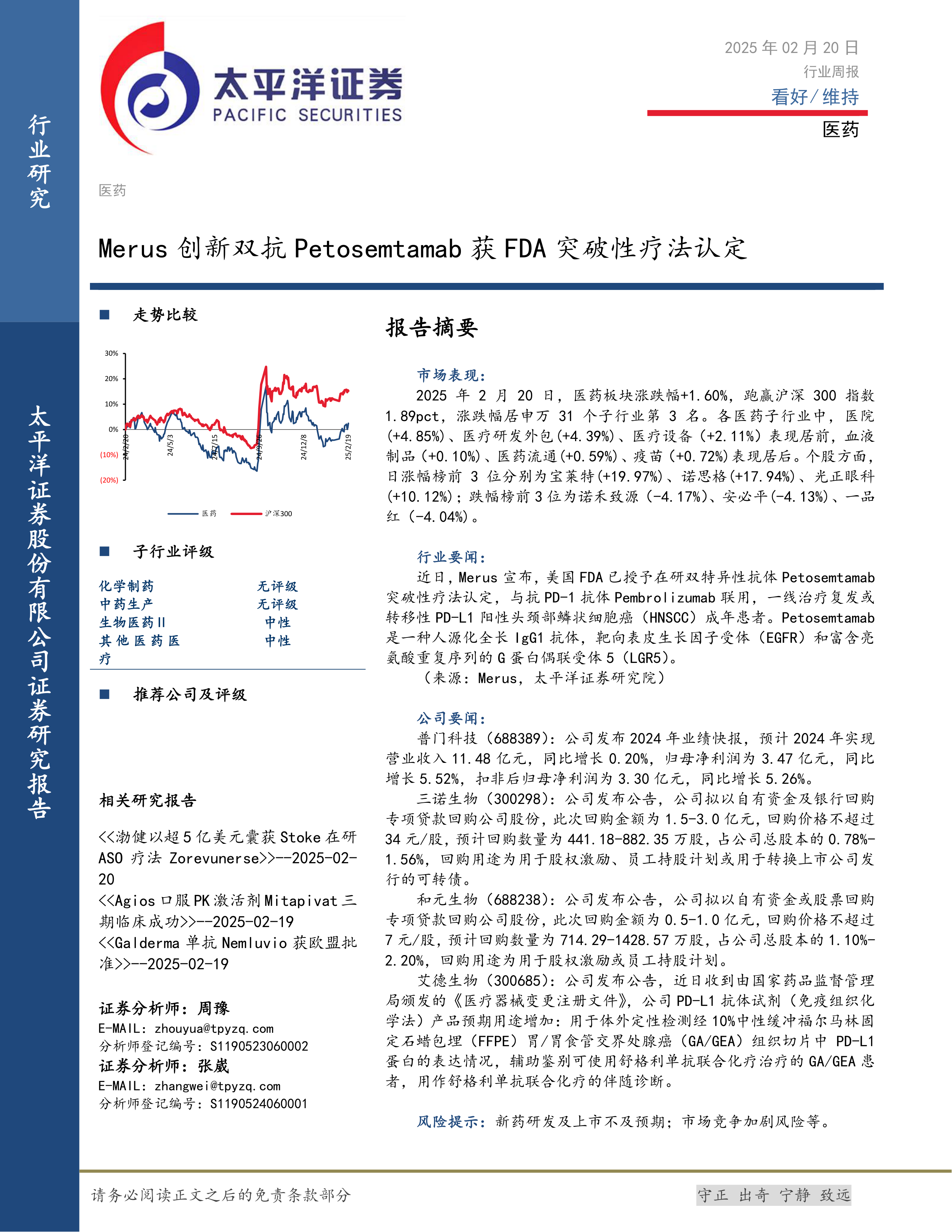 本报告对2025年2月20日医药行业进行了全面分析,涵盖了市场表现、子行业评级、公司要闻以及相关研究报告等方面。数据显示,医药板块整体表现强劲,跑赢大盘,部分子行业和个股表现突出。Merus公司创新双抗Petosemtamab获得FDA突破性疗法认定,为行业发展注入新的动力。部分公司发布的业绩快报和股份回购计划也反映了行业良好的发展态势。然而,报告也提示了新药研发及上市不及预期、市场竞争加剧等风险。投资者需谨慎评估风险,做出理性投资决策。