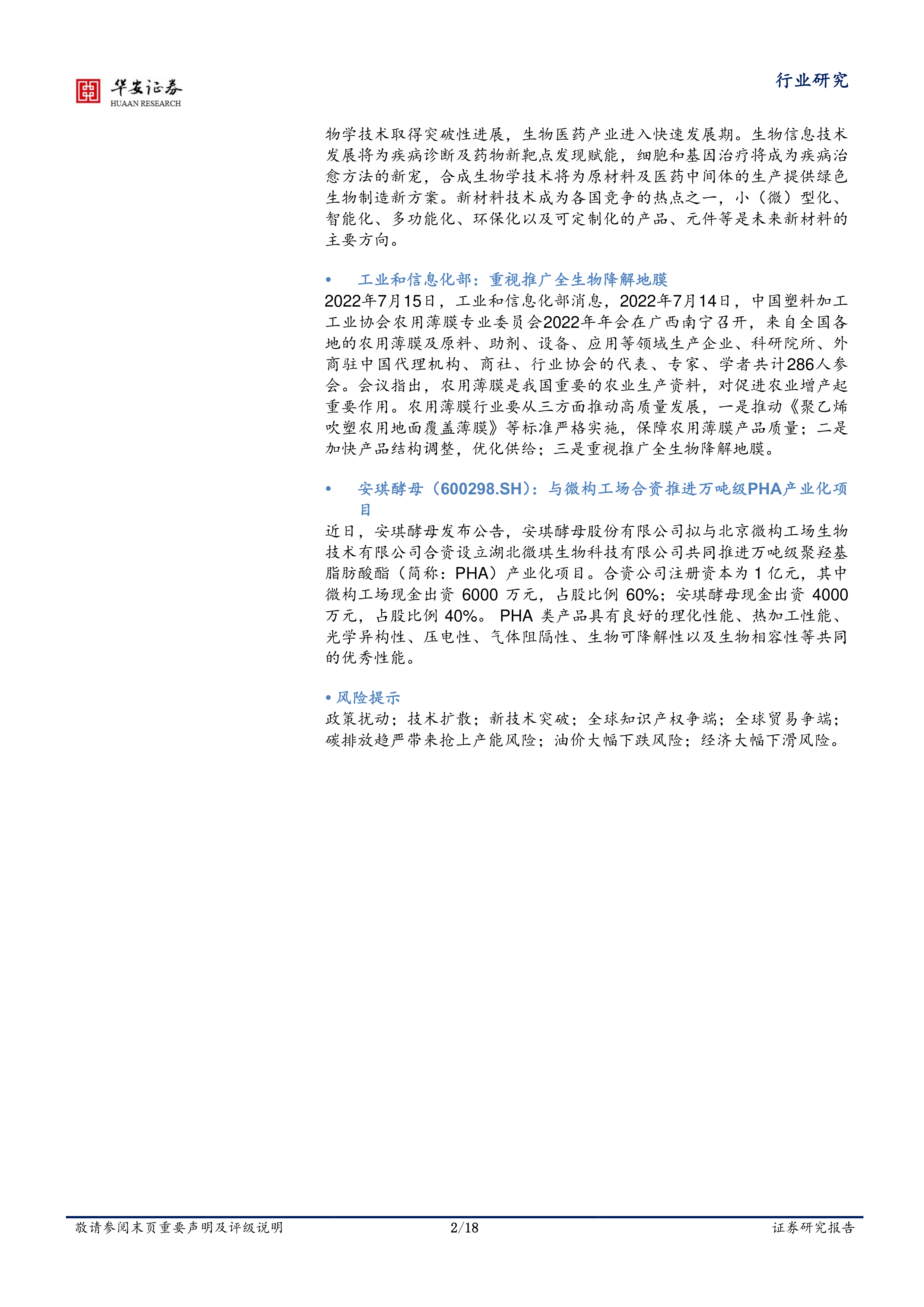 华安证券化工团队发表的《合成生物学周报》是 一份面向一级市场、二级市场,汇总国内外合成生物学相关领域企业信息的行业周报。目前生命科学基础前沿研究持续活跃,生物技术革命浪潮席卷全球并加速融入经济社会发展,为人类应对生命健康、气候变化、资源能源安全、粮食安全等重大挑战提供了崭新的解决方案。 近日国家发改委印发《“十四五”生物经济发展规划》 ,生物经济万亿赛道呼之欲出。